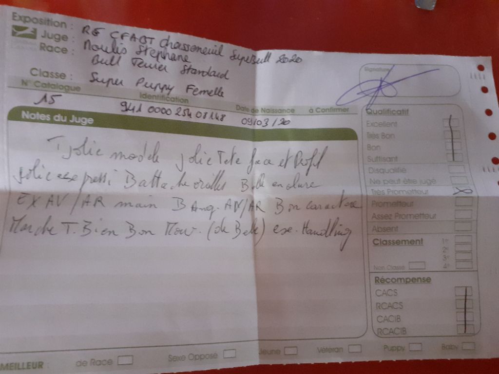 Très jolie modèle jolie tête face et profil jolie expression bon attache oreilles belle encolure excellent AV/AR main bonne angulation AV/AR bon caractère marche très bien bon mouvements de bébé excellent handling
