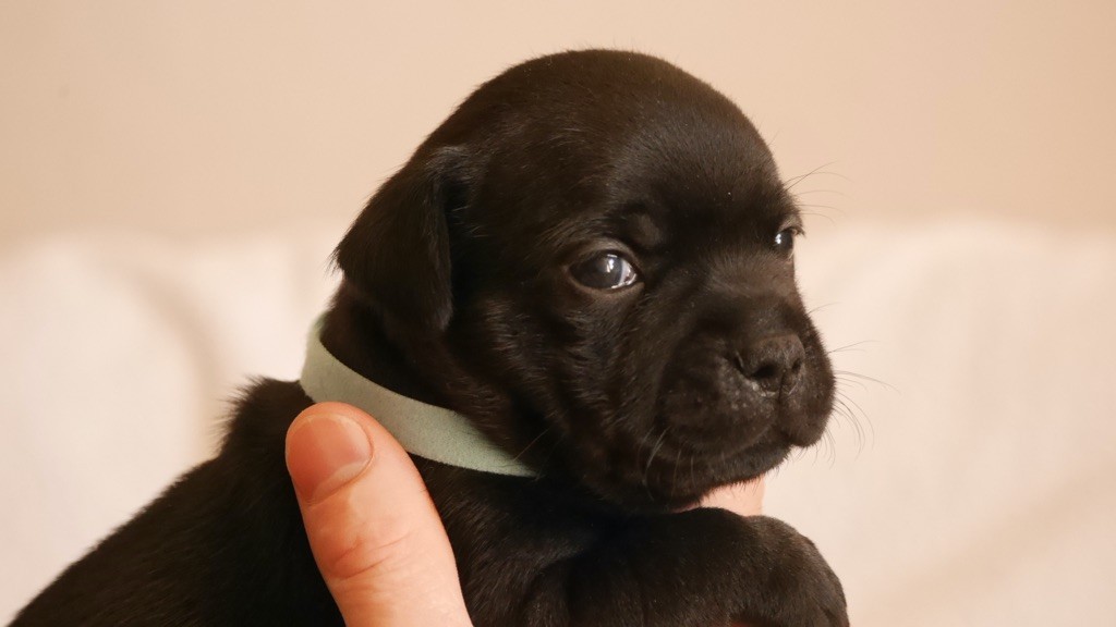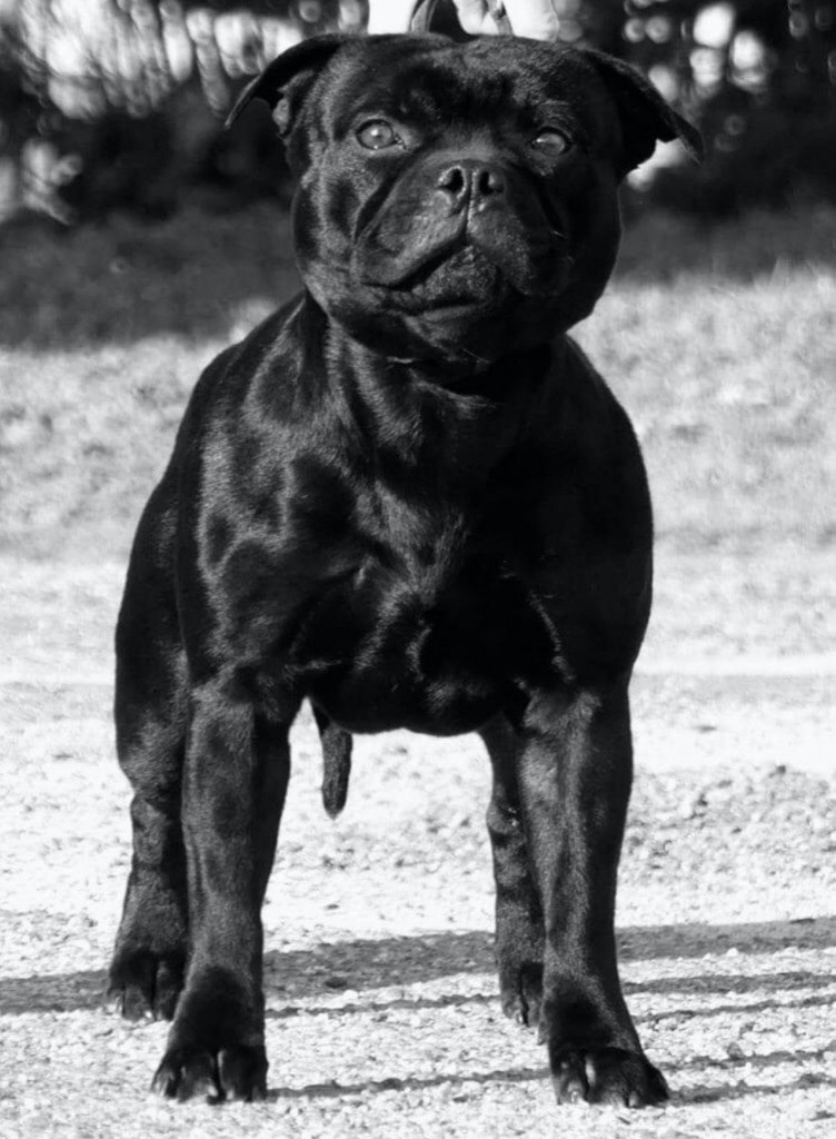 Olam est un super chien, avec un bon caractère, il sait ce qu'il veut et ne veut pas, il nous suit partout , comme tout suffie il est super affectueux, c'est le troisième garçon de la maison, et il sait transmettre son caractère calme à sa progéniture, il est puissant en tête , osseux, avec de bons aplombs, il a également une superbe robe noire (black brindle).Il est également cotation 4 depuis ses 18mois et a souvent fait des classements en régionale ou spéciale de race sous différents juges étrangers spécialistes de la race.