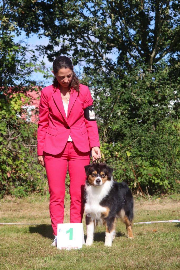 Exc constitution La tête pourrait être plus féminine.Exc yeux formeDCCExc port d'oreillesBelle encolureExc ligne du dessusExc angulation avant, TB angulation arrière.OSS/ correcteRobe riche en couleurManque de poussée au alluresExc caractère