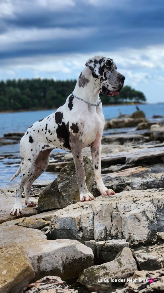 Excellent type, format, construction.Très belle tête, excellent rapport crâne/chanfrein.Pour 1 arlequin les yeux sont très sains.Belle encolure, dessus et croûpe.Excellente poitrine, poitrail et ossature.Belle couleur.