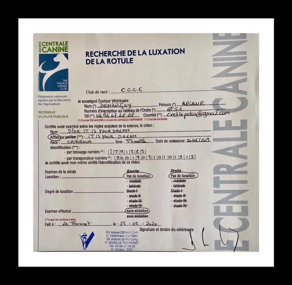 LUXATION DES ROTULES - INDEMNE DE LUXATION POUR LES DEUX ROTULES EXAMEN PRATIQUÉ PAR UN VÉTÉRINAIRE ET ENREGISTRÉ AU CCCE