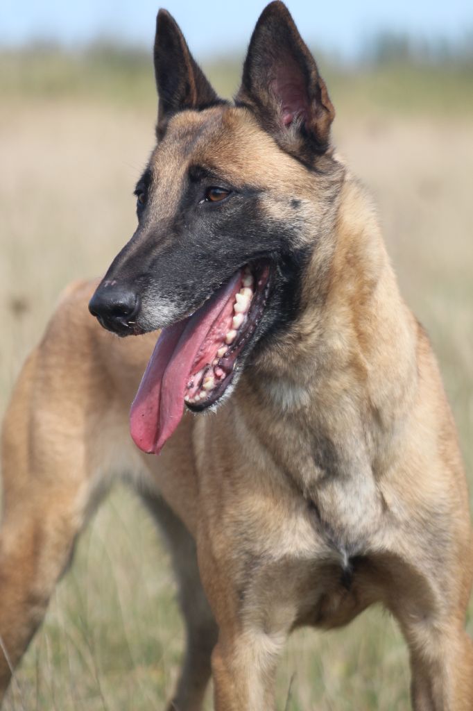 TAYA est une chienne très énergique. Partie à 2 mois, revenue à l'âge de 7 mois à l'élevage. Ses propriétaires ne savaient plus la canaliser. C'est une chienne très proche du maître, qui a du caractère, un bon mordant. Elle va restée à l'élevage pour devenir l'une de nos futures lices en fonction des tests de santé. Nous avons gardé sa soeur TYPHÉE qui elle évolue en Ring 3.