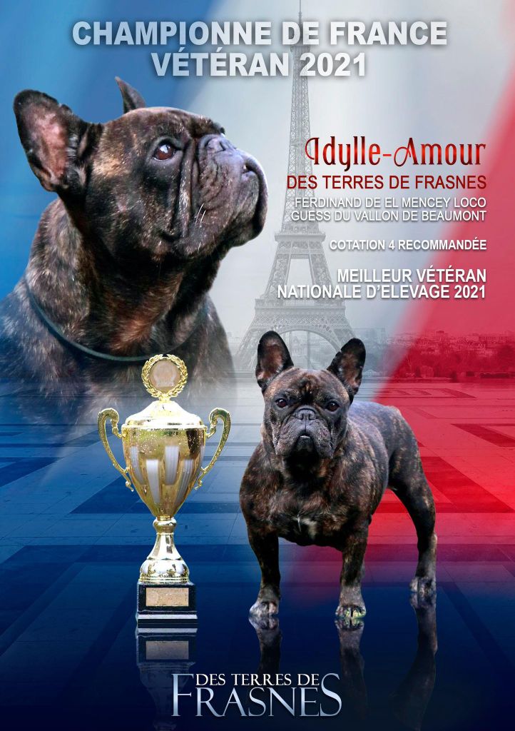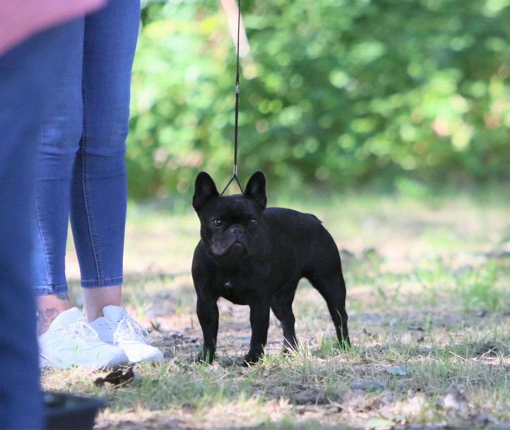 Bonne Construction. Tête typique, excellent profil.Oreilles standard, chanfrein suffisant.Oeil rond et foncé, Excellente pigmentation.Narines bien ouvertes, excellente respiration.Mâchoire bien en berceau.Bon prognathisme et denture.Ligne du dessus un peu trop droite.Excellente poitrine.Queue embryonnaire.Bons aplombs avant. Jarrets suffisamment angulés.Bringé foncé.Serre un peu à l'arrière, bon mouvement avant.