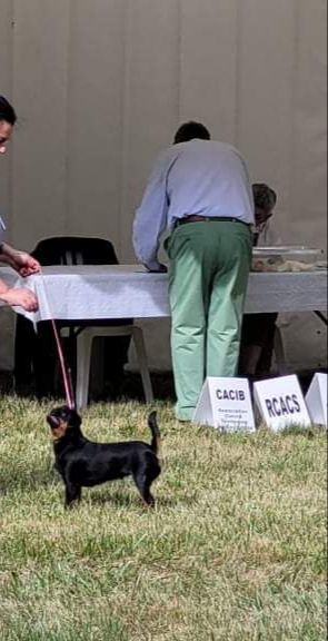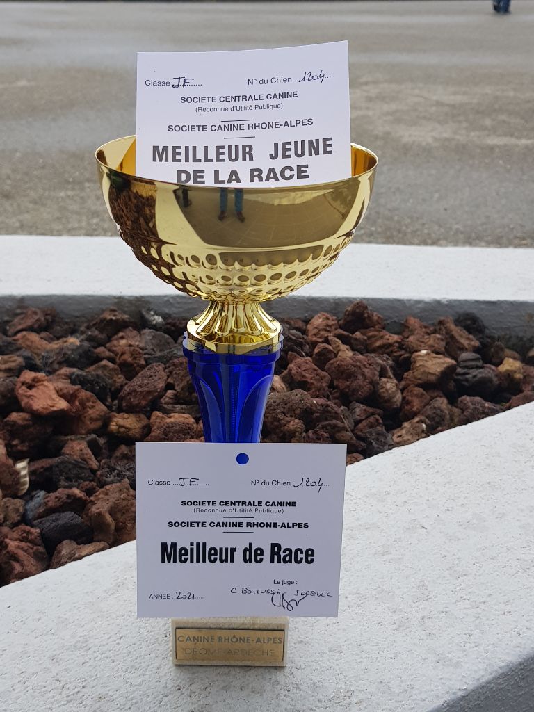 Crâne correct, oeil exc, exc couleur, nez bien placé, menton correct, Exc poitrine, exc épaule, dos solide, angulation arrière correcte, TB croupe, feu intenseBonne demarcheSe presente bien
