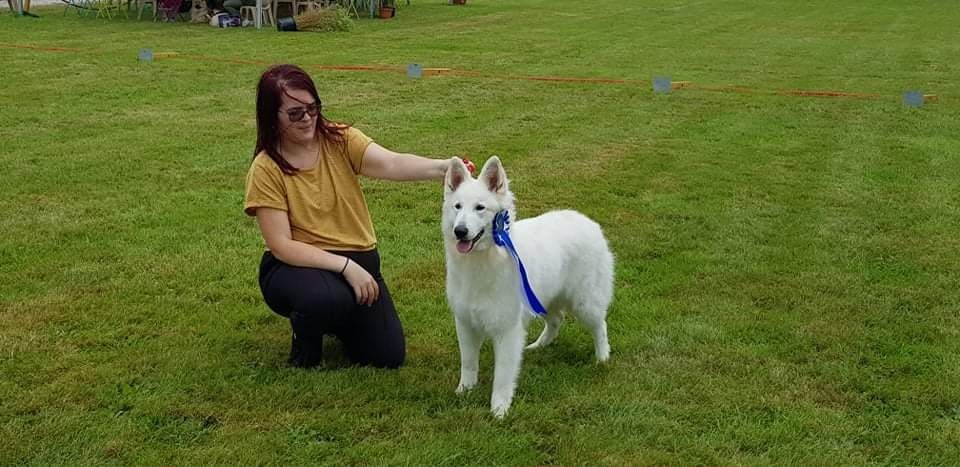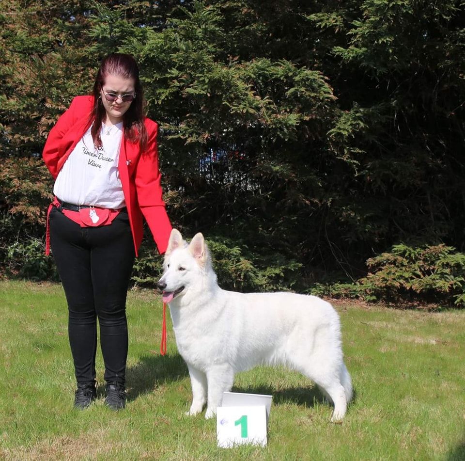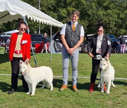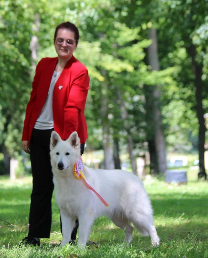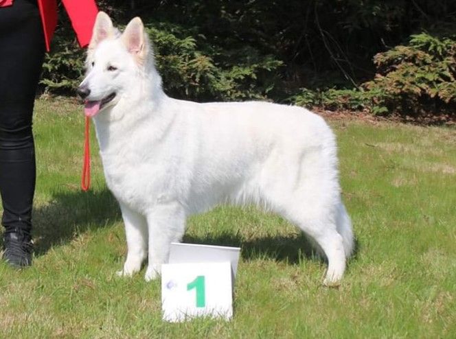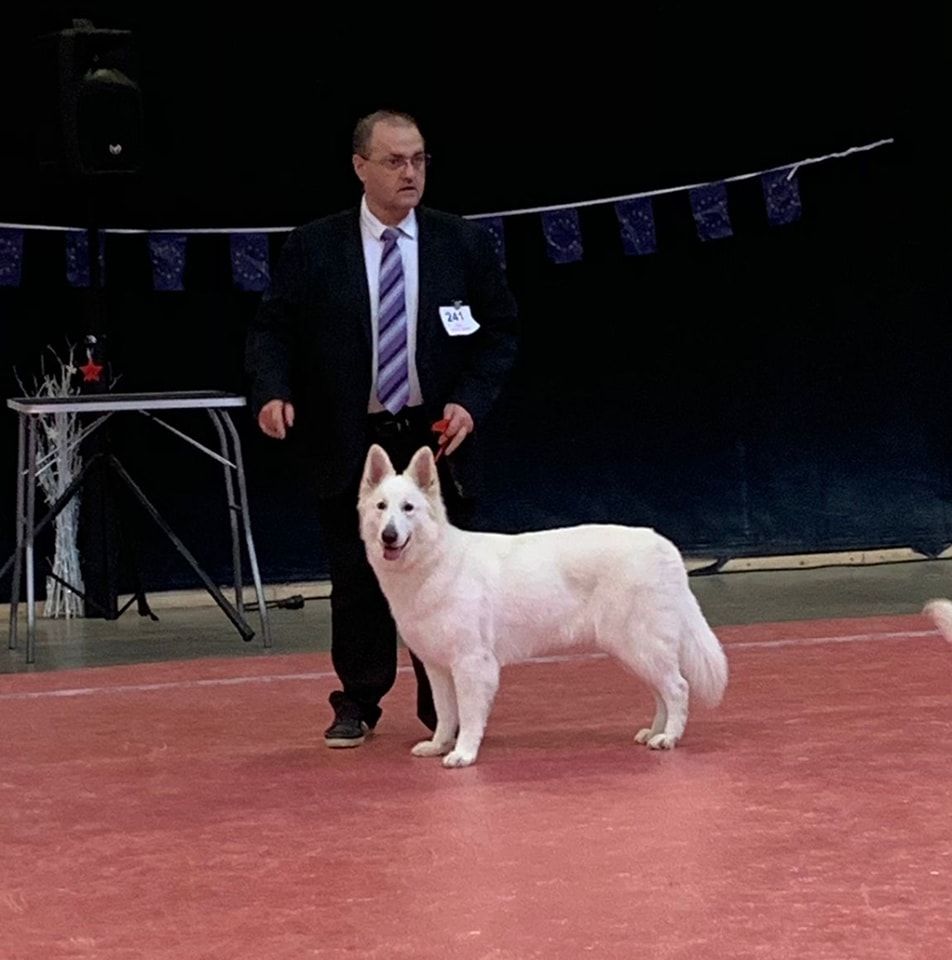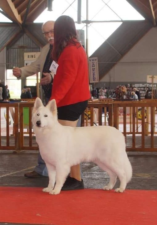 Bon format, Chienne assez puissante, Jolie tête, Oeil correct, Bonne pigmentation, bonne construction d'ensemble, Très belle épaule et angulation arrière, Bonne démarche, Bel condition