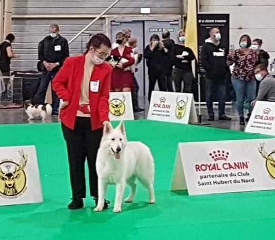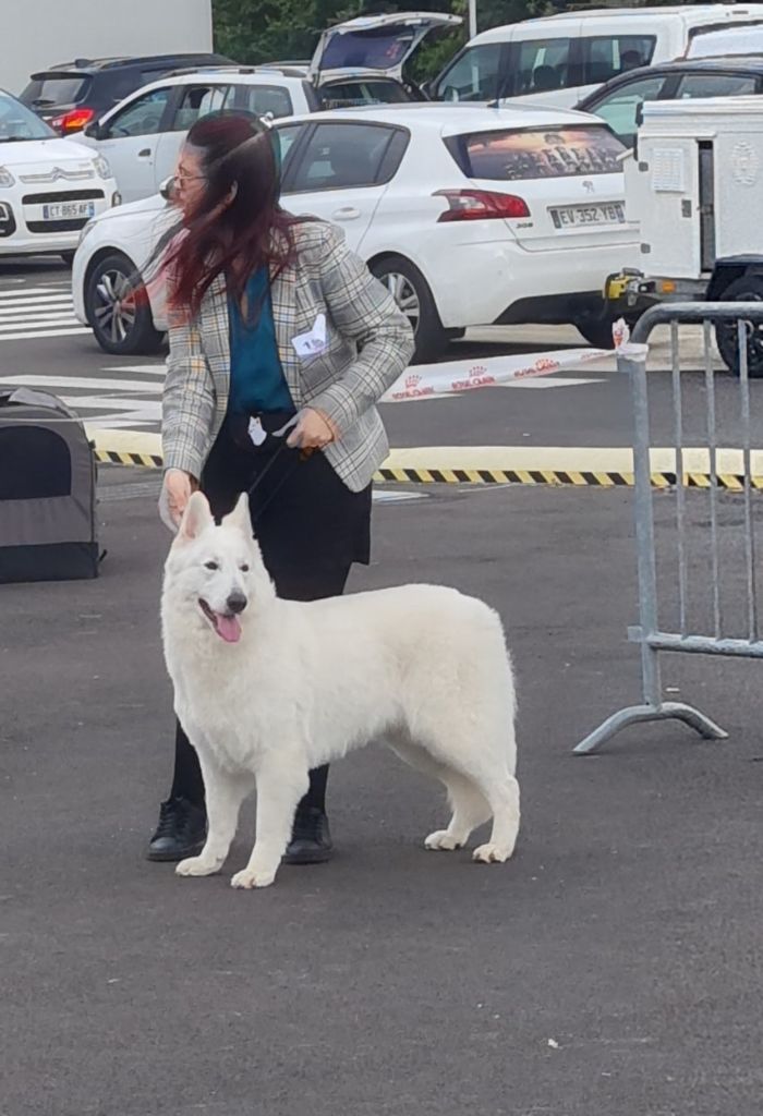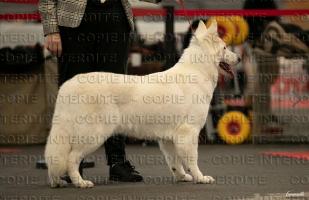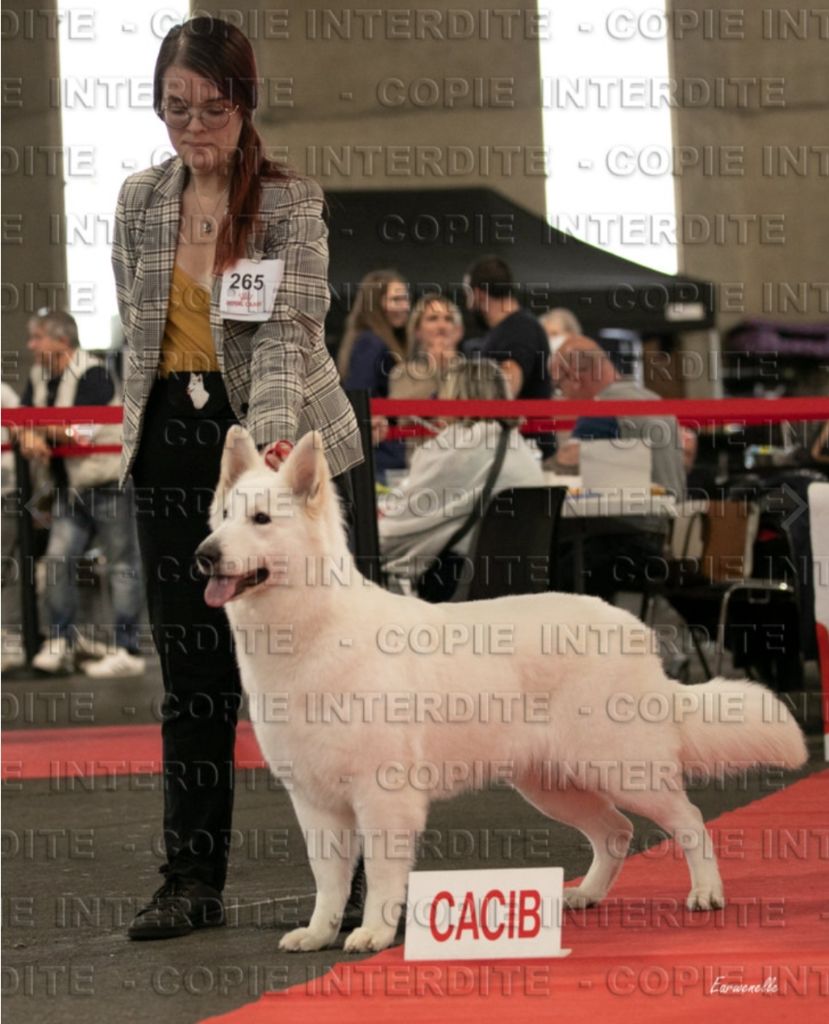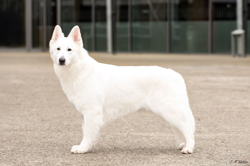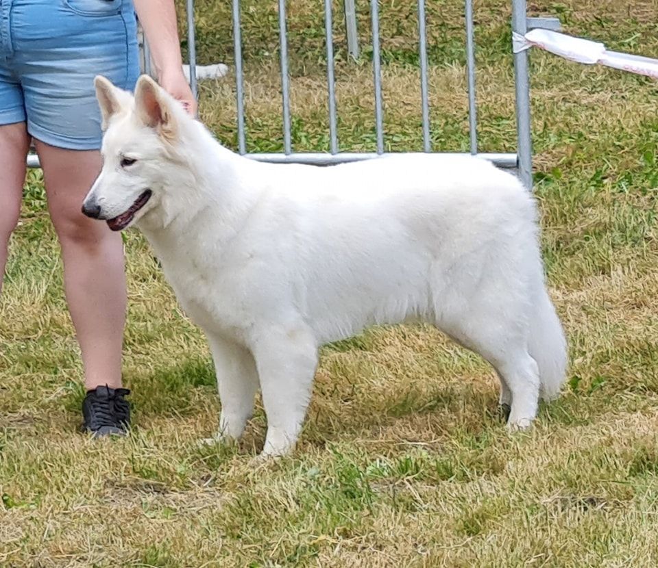 Très bonne tête, Oeil de bonne couleur, Excellente pigmentation paupière et truffe, Oreille bien portée, Bonne encolure, Pointe supérieure de l'épaule un peu haute, Bonne ligne de dos, Arrière main bien construit, Cuisse bien galbée, Très bonne attache de fouet bien portée, Mouvement correct dans ses 3 dimensions
