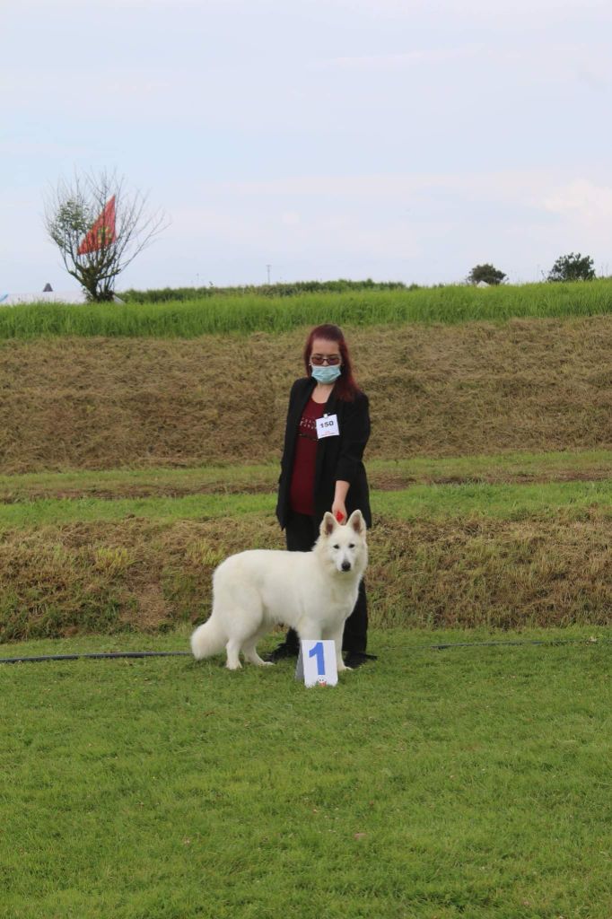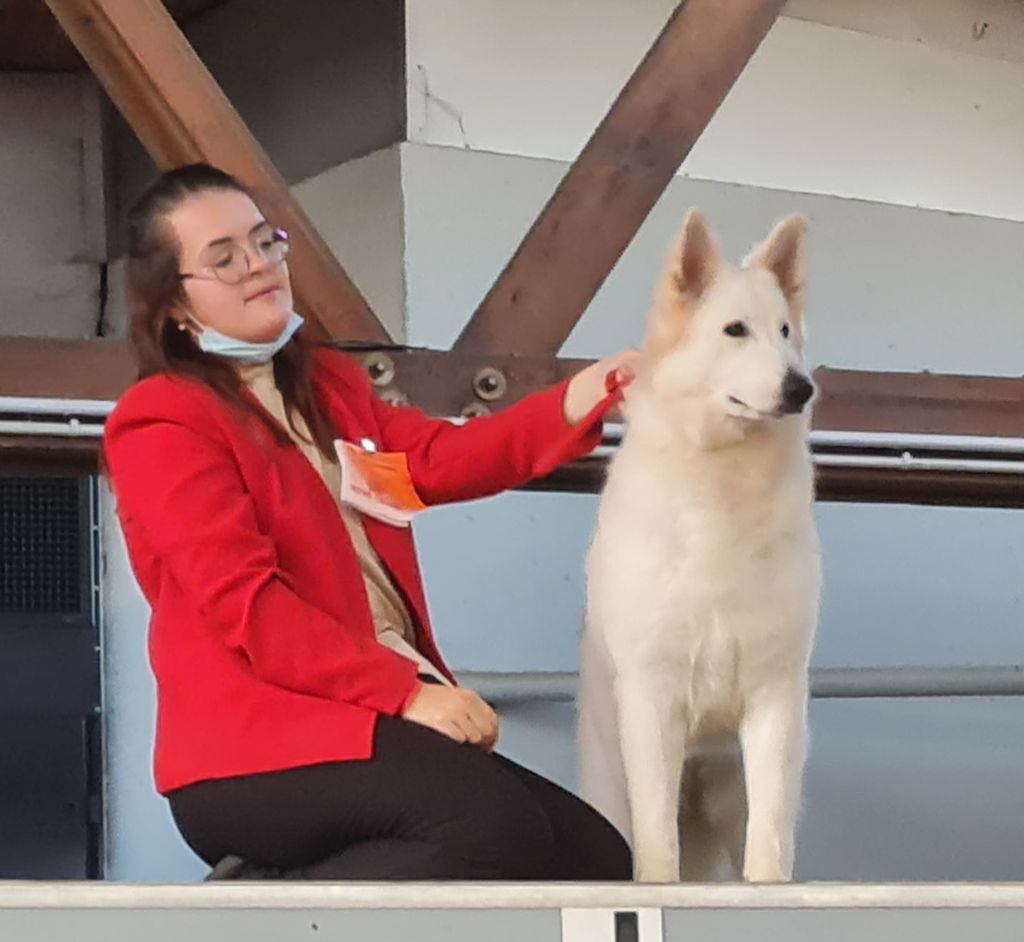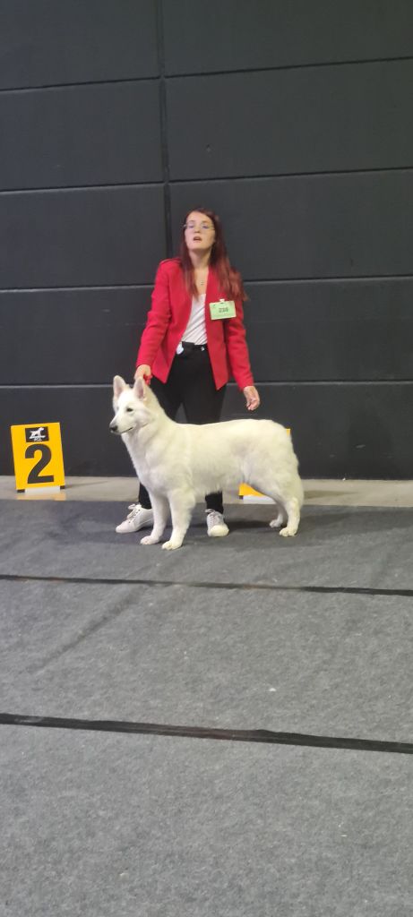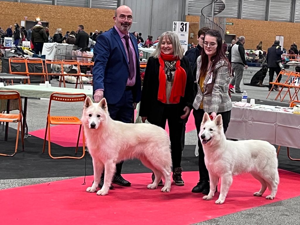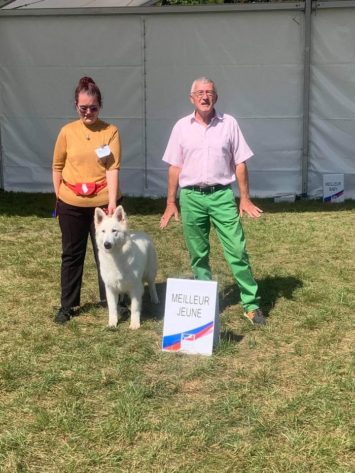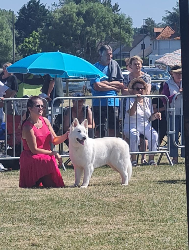 Très bonne tête, Oeil de bonne couleur, Excellente pigmentation paupière et truffe, Oreille bien portée, Bonne encolure, Pointe supérieure de l'épaule un peu haute, Bonne ligne de dos, Arrière main bien construit, Cuisse bien galbée, Très bonne attache de fouet bien portée, Mouvement correct dans ses 3 dimensions