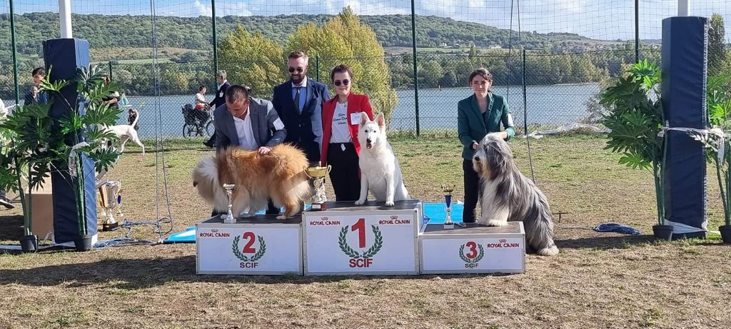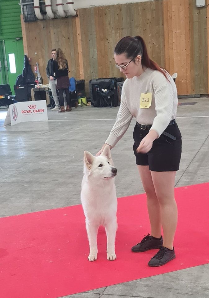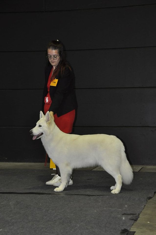 Très bonne femelle, Tête avec de bonne proportion, Excellente expression féminine, Bonne construction anatomique, Poils et pigmentation excellent, Excellent mouvement