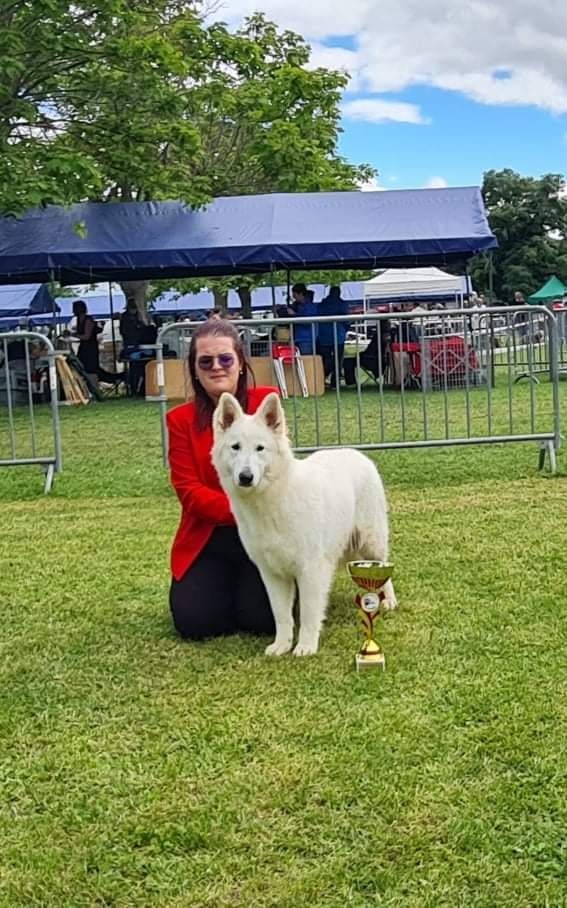Sujet féminin déjà mature, Excellente tête ligne et proportion, Excellent oeil forme et couleur, Excellente pigmentation truffe et couleur, Oreille de bonne taille bien placée, Très belle encolure, Excellente ossature, Excellent mouvement régulier de bonne amplitude, Excellente condition générale et bonne présentation