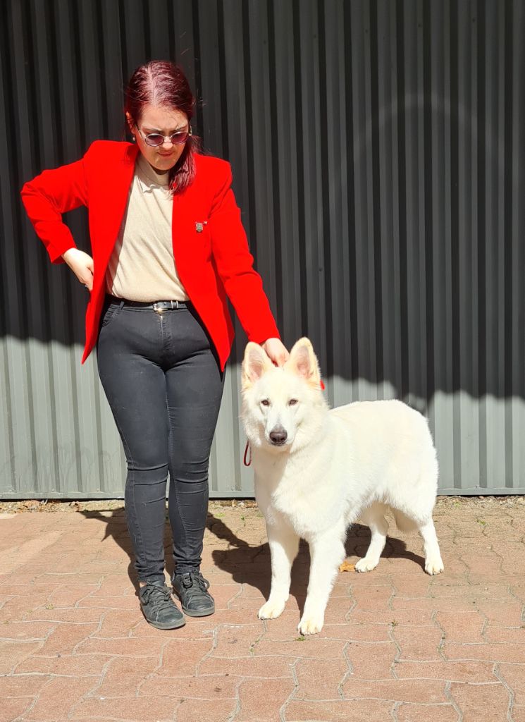17 mois, Jolie femelle avec une jolie expression, Oreille bien placée et portée, Excellente pigmentation générale, Yeux de belle forme et couleur, Postérieur solide, Bonne ligne de dos, Bonne angulation arrière, Jolie couleur et excellente texture de poils, Marche très bien