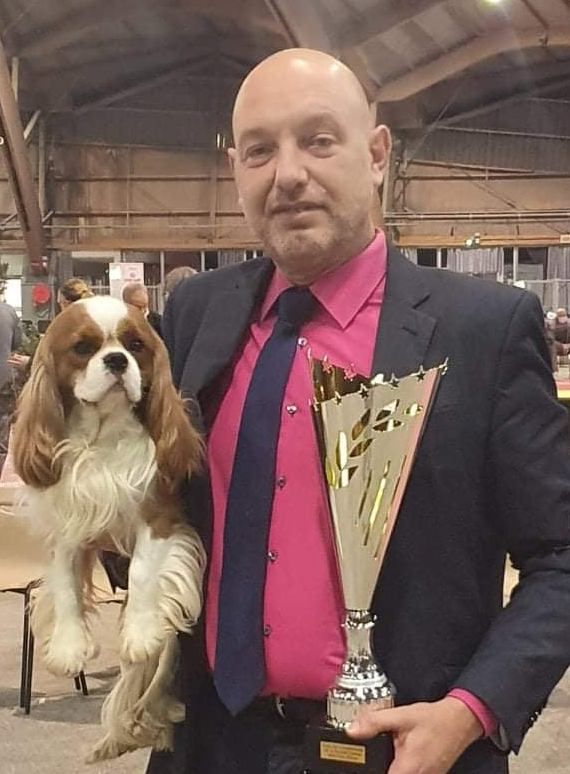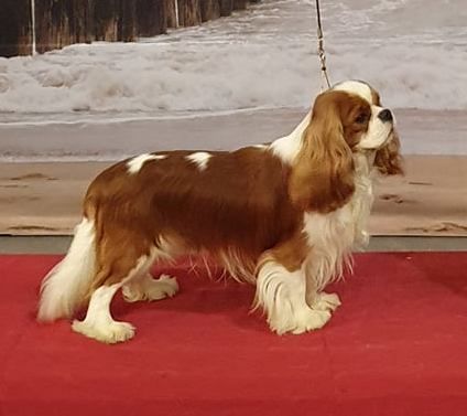 Joli chien, belle tête, jolis yeux, belle expression, le chanfrein pourrait être plus court, DCC. Excellente épaule, côte et poitrine. Dos solide, excellent fouet et arrière-main. Belle fourrure et couleur blenheim. Belles allures vives et régulières.