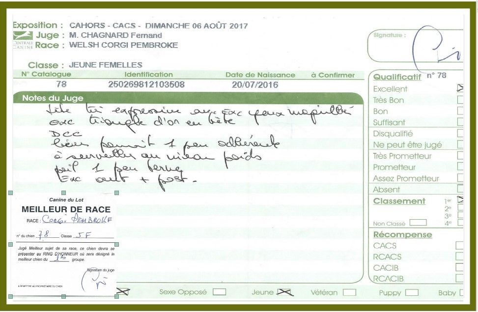 - 1 ier Excellent en jeune, Meilleur jeune - Meilleur de race
