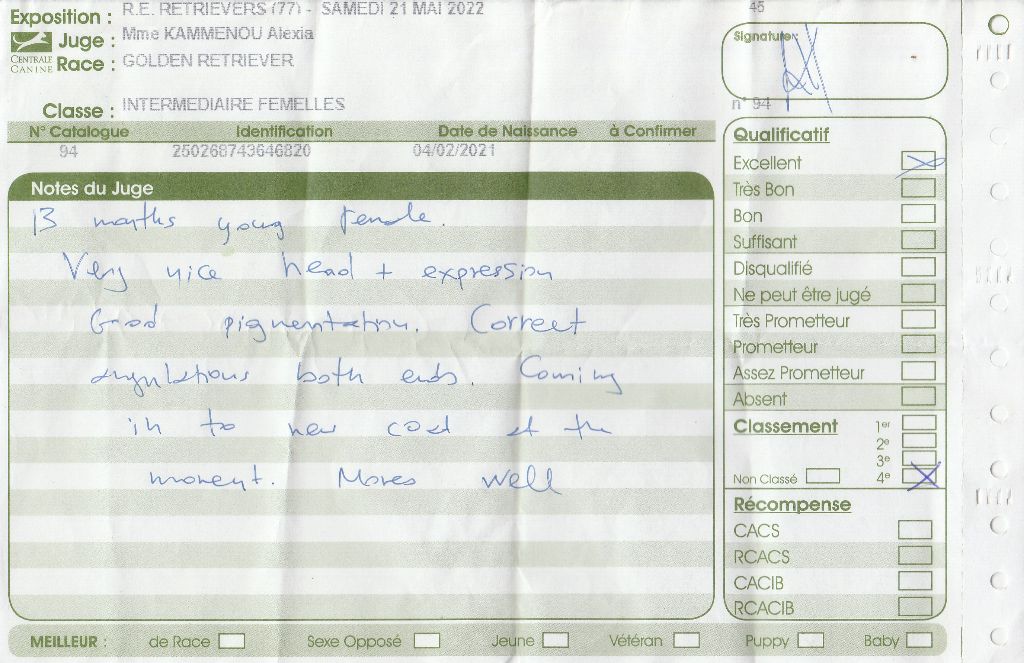 Tares oculaires - indemne (13/10/2022)PRCD - SainIchtyose (ICT-A) - Porteur sainHanches - A/AGRPRA 1 - Porteur sainGRPRA-2 - SainCoudes - 0/0