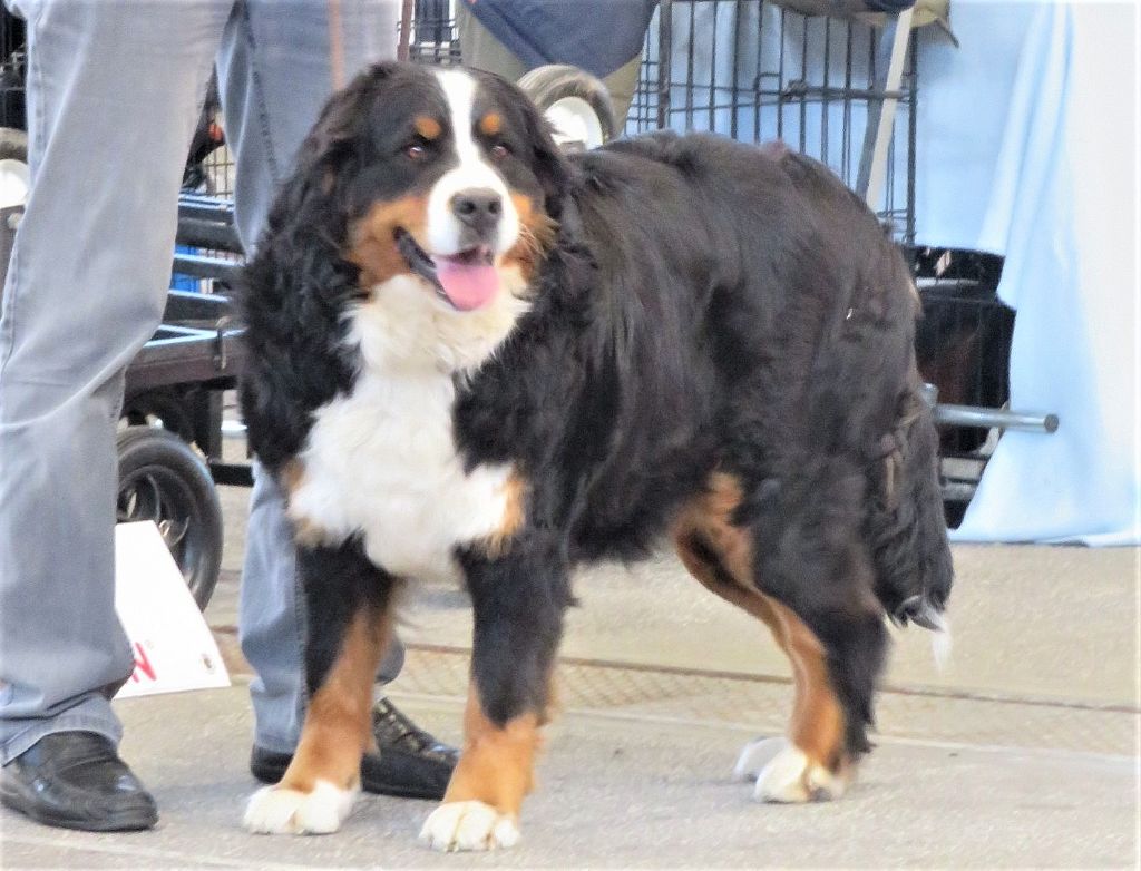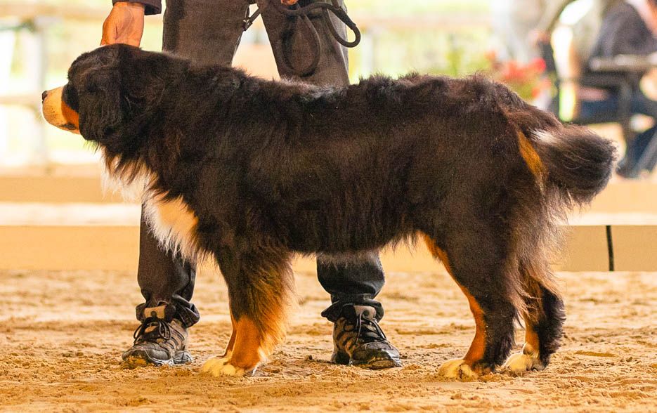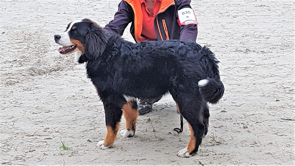 Pour sa première sortie en expo. Sunday, très à son aise durant tout le we, s'en sort très bien. 12 femelles étaient présentes. Très prometteur classée, c'est plutôt encourageant, même si cela ne présage rien dans l'avenir.6 mois (7 dans 3 jours) - Jolie tête de bébé, gaie et expressive - Oeil pourrait être plus foncé - TB ossature - TB angulations - Aplombs TB à l'avant et légèrement ouverts à l'arrière avec présence d'ergots - EXC dos - EXC allures pour l'âge, TB fouet - EXC caractère.