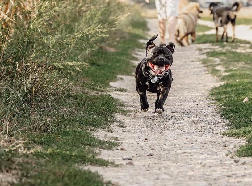 Staffie bien dans ses pattes, aussi actif dans ses activités que dans les câlins.