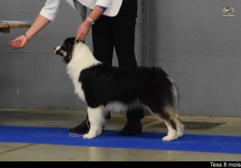 5 mois - noire tricolore - magnifique petite chienne ! tête : magnifique expression - exc rapport crâne chanfrein - exc crâne - exc stop - exc chanfrein - exc pigmentation de la truffe - bouche sèche - exc forme de l'oeil - exc oreilles, port et forme. Corps : Exc encolure, ligne de dessus - exc croupe - bonne ligne de dessous - bon grasset - exc aplombs av et ar - exc pieds - exc poitrine. Allures : Exc prise de terrain - fait déjà le job ! - exc caractère - exc présentation. Pas de ring d'honneur en raison des mesures sanitaires Covid