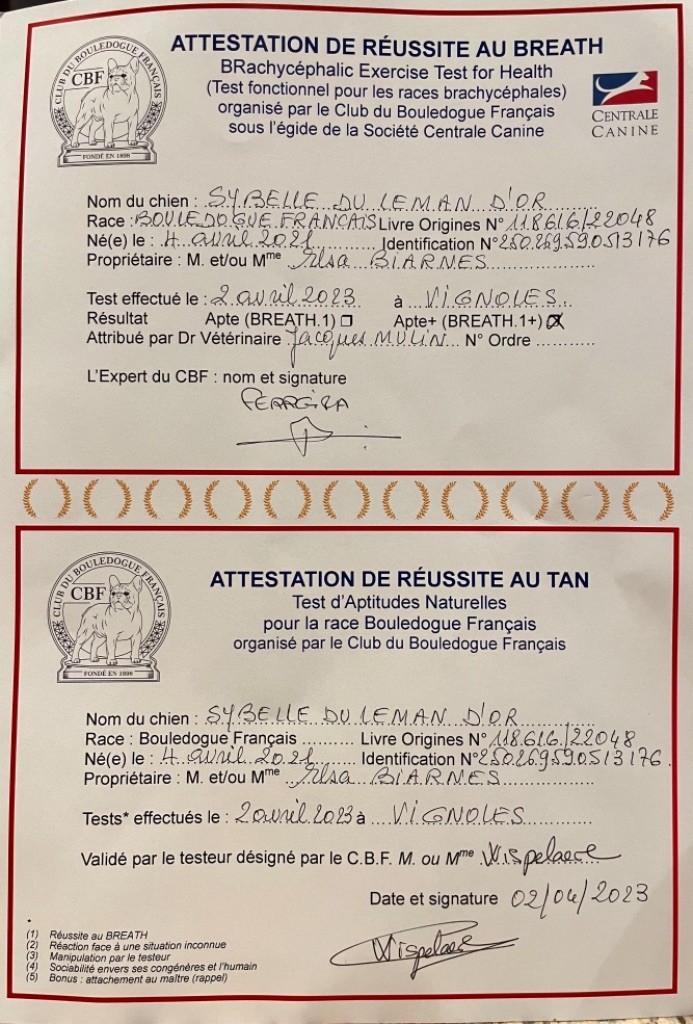 Myelopathie Dégénérative - DM1A-1.1 homozygote normal (indemne)Luxation des rotules - IndemneDilution (DIL) - LocD-D/D (indemne)Breath - Breath.1+ADN - oui Échographie cardiaque - Indemne stenose pulmonaire PS-0 Tan - Validé