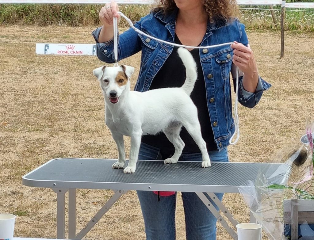 Chienne pétillante, bien dans le type.Bien proportionnée, exc tête, yeux, oreilles, ossature, poitrine.TB dessus, queue attachée, portée.Exc pigmentation, poilsTrès beaux aplombs, coudes bien placés et pieds.Mouvement : se déplace bien, s'exprime bien.Correct à l'avant et bien à l'arrière.