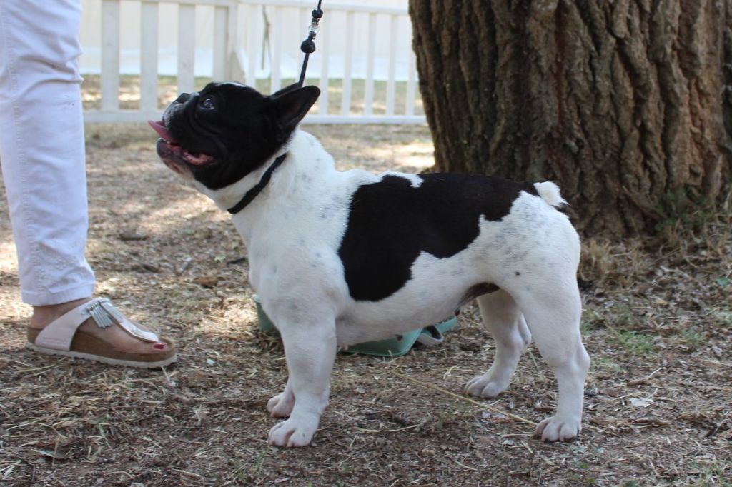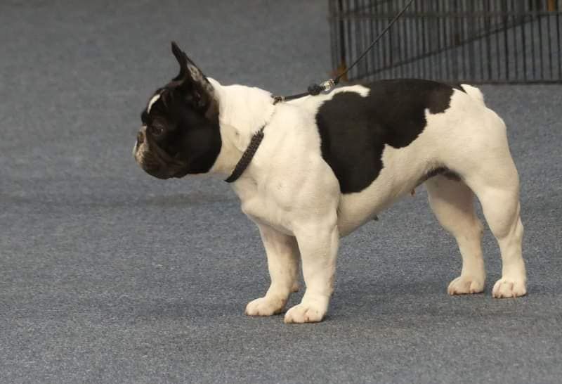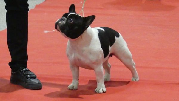 Format correct-Jolie tête-Excellent prognathisme-Mâchoire en cuillère qui n'existe pas-Le dessus est encore un peu plat pour son âga-Excellente poitrine-Excellente queue-Présence de nombreuses tavelures-Marche et mouvement corrects-Couleur à la limite du hors standard (3 poils fauves dans le noir)