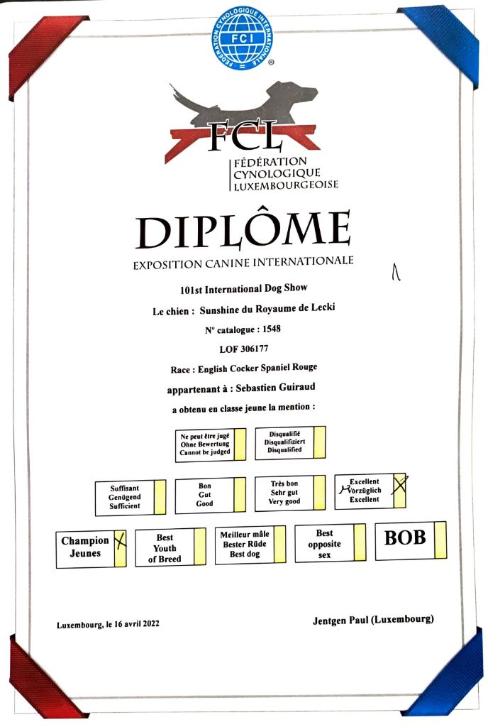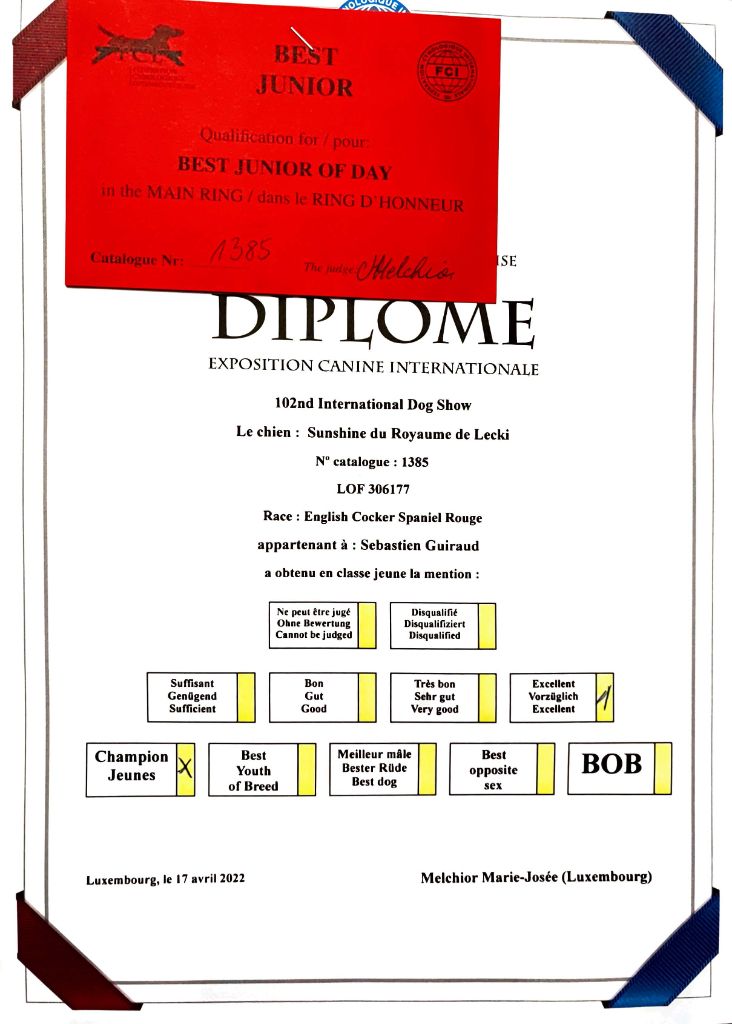 - Luxembourg 2022 : 1er Excellent classe Jeune et Jeune Champion du Luxembourg