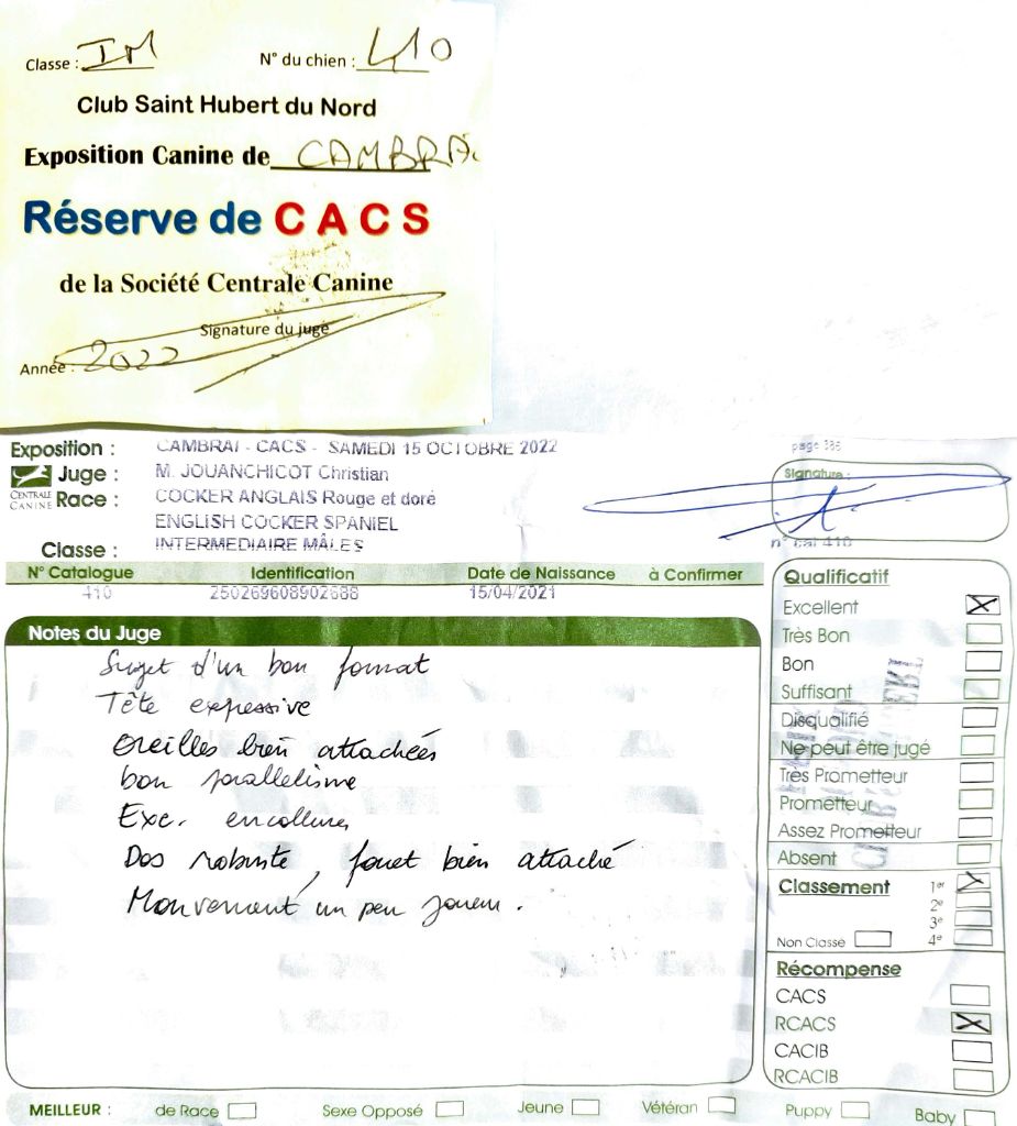 - Cambrai 2022 : 1er Excellent classe Intermédiaire & RCACS