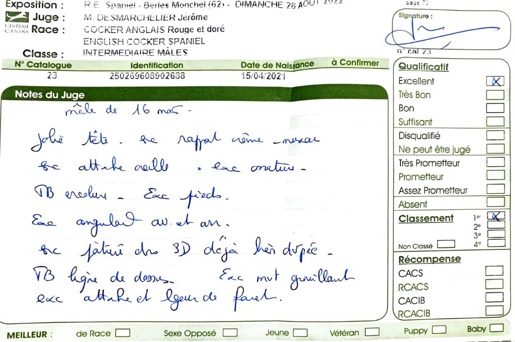 - R.E Spaniel Club Délégation Nord-Pas-de-Calais 2022 : 1er Excellent classe Intermédiaire