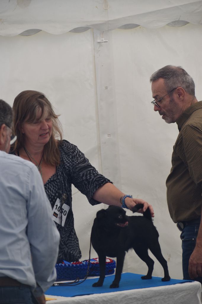 Excellente mâchoire en berceau, truffe large bien orientée, narine bien ouverte, petite oreille timide, la tête doit s'éclater, antérieurs bien parallèles, jolis pieds de chat, excellente poitrine, dos bien soutenu, fouet bien incéré, excellentes angulations arrières et musculature, très jolie robe noire, mouvement timide.