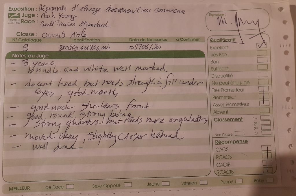Sélectionné pour le ring d honneur. Il a fait parti des 5 Sélectionné sur le ring pour le choix du podium. Du groupe 3.Commentaires:Chien puissant TB charpente,Ossature,court.TB tête Articulé correct.Excellent ?il. Oreilles bien attachées,portées.TB applombs/ pieds.Queue bien attachée et portée.Ligne de dessus TB.Bien en mouvement. Ligne de dessous parfaite.Se déplace bien.