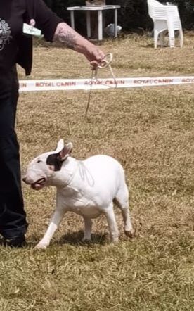 Tête bien bombée,bel oeil foncé,denture correcte,TB port d oreilles, aimerais plus forte ossature,TB pieds,bras un peu courts et verticals,Exl côtes,TB arrière main,la ligne de dos doit se tendre, présentée un peu grasse.