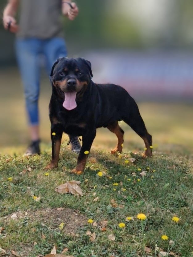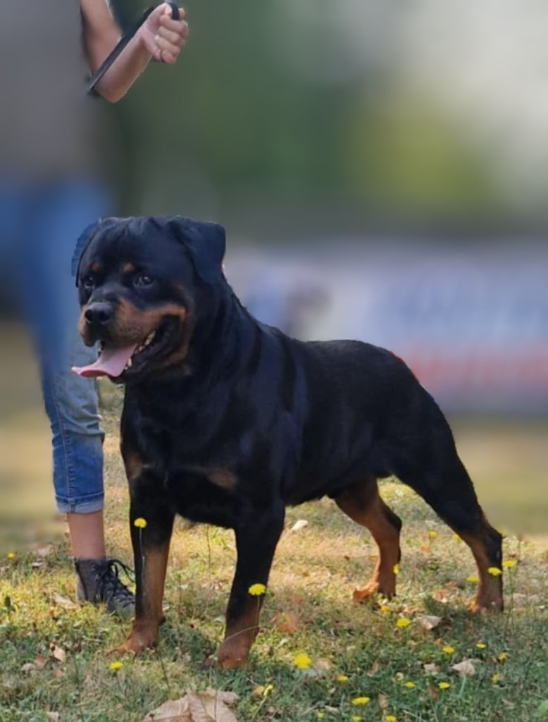Très bon gabarit, bonne ossature, bon crâne, belle dents ,bonne ligne de dos, excellent poitrail, très bonnes angulations et aplombs, excellent caractère stable, fort et sûr de lui un tempérament pur rott avec un regard sans faille, joueur et affectueux, il peut aussi se montrer dominant et protecteur, sociable avec ses congénères ainsi qu'avec tout les autres animaux en général.
