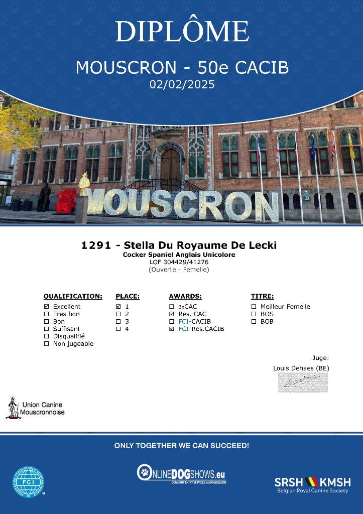 - Mouscron 2025 (Belgique) : 1er Excellent classe Ouverte, RCAC & RCACIB