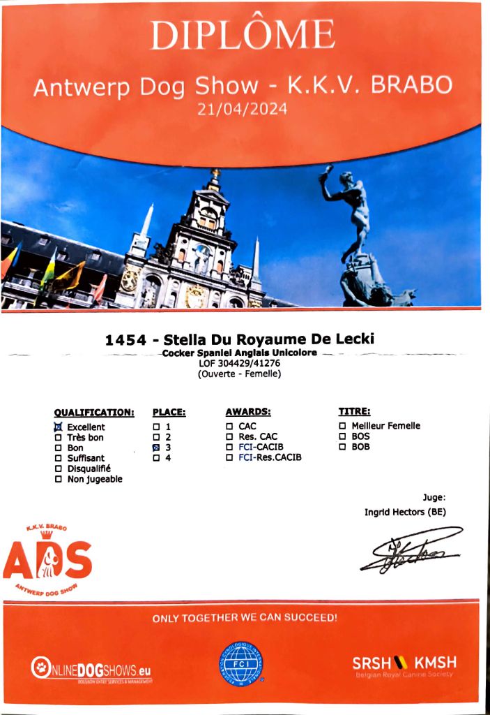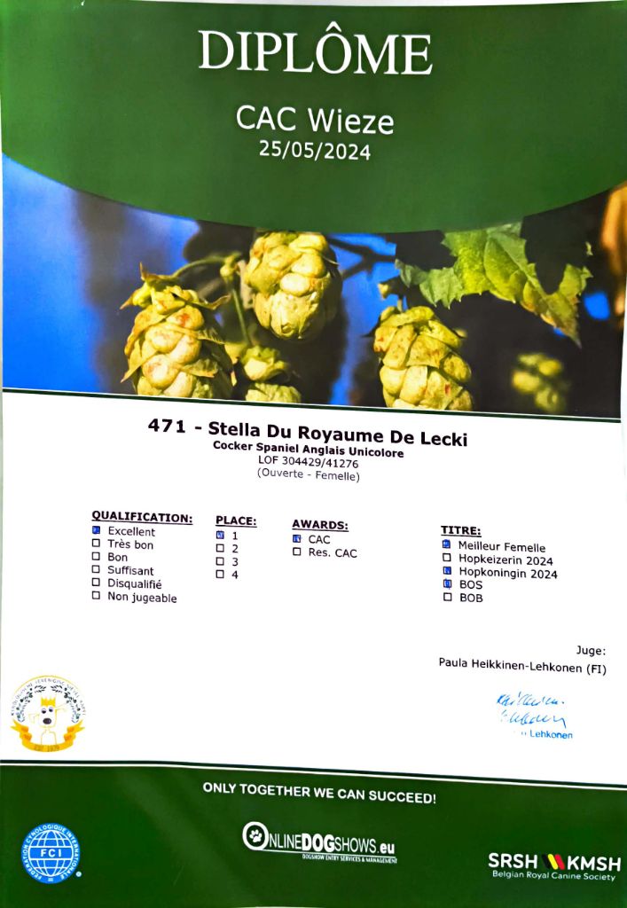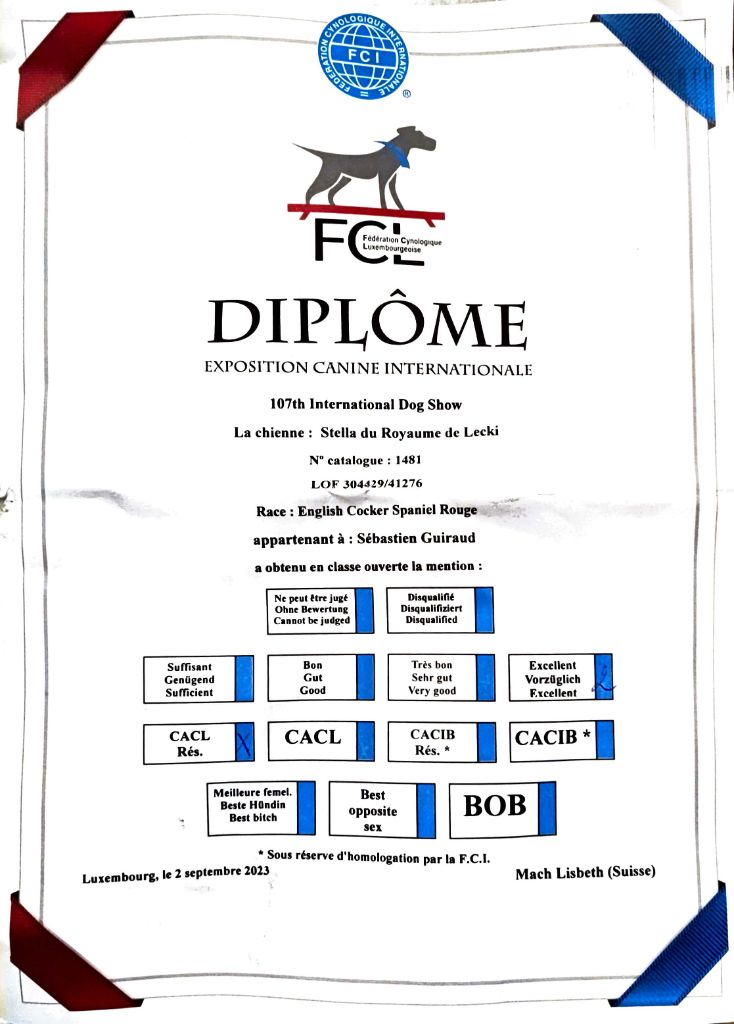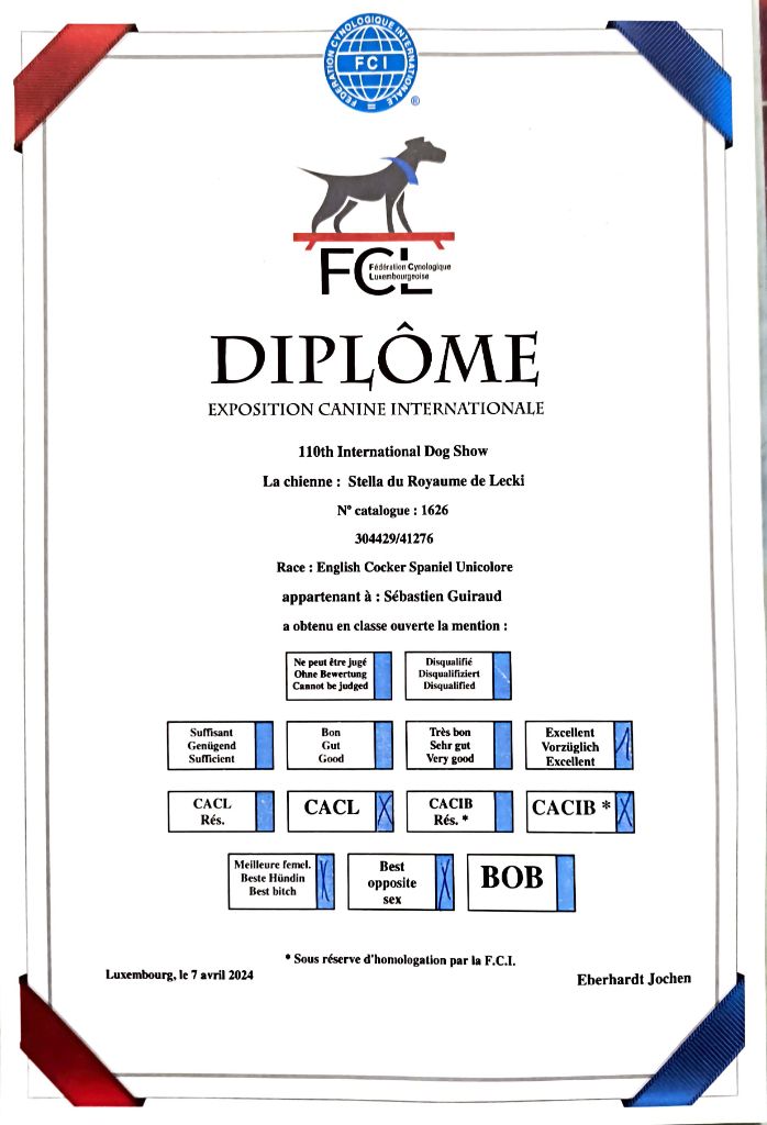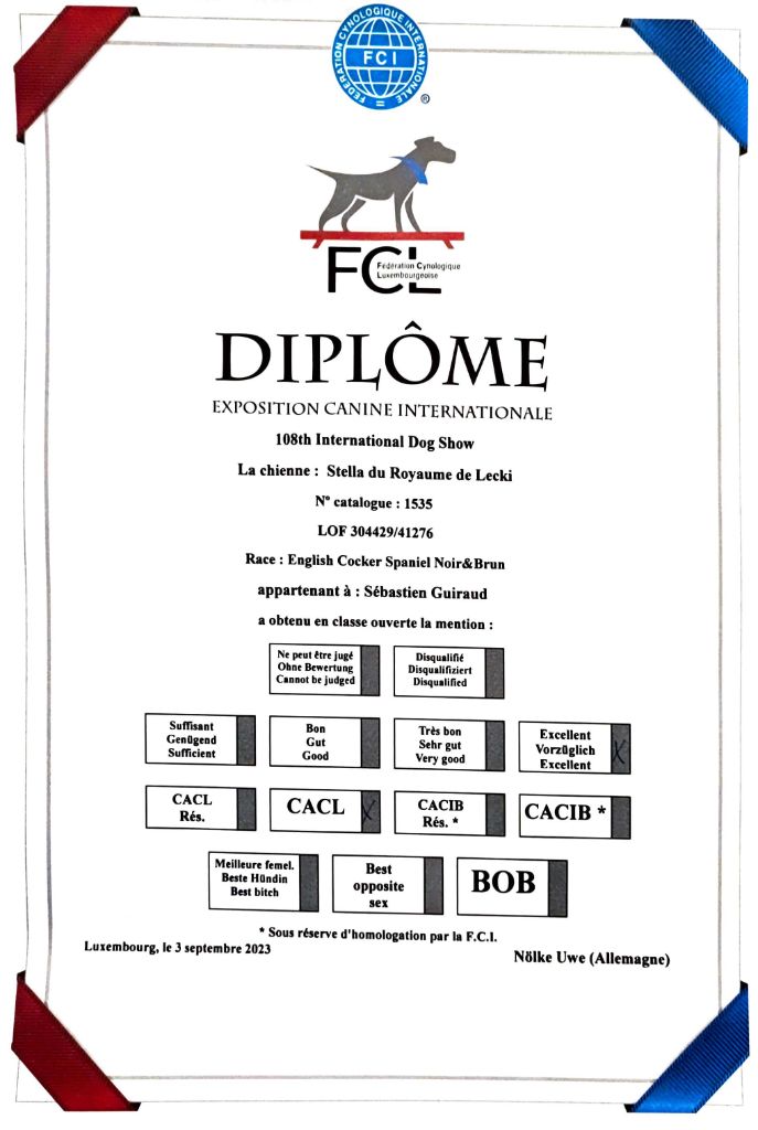- Luxembourg 2024 : 1er Excellent classe Ouverte, CACL, CACIB, BOS & Champion du Luxembourg