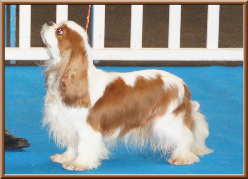 Exc yeux - Exc rapport crâne-chanfrein - Oreilles attachées basse - Très jolie sortie d'encolure - Très bonne poitrine - Bonne longueur de rein - Ex angulations arrières - Fouet bien attaché - La ligne du dessus pas assez tendue aujourd'hui - Bonne couverture de terrain mais fouet un peu timide.Cotation 2 en cours.