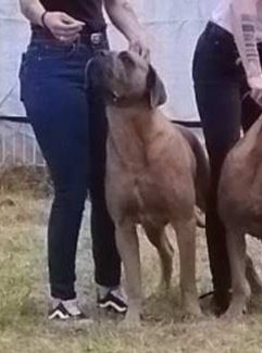 2 ans, dentition correcte complète, bonne taille, très bonne ossature. Jolie tête masculine avec bon profil et proportions. Angulations avant et arrières moyennes. Poitrine suffisamment développée. Se déplace avec aisance, avec une amplitude correcte et le dos qui tient.