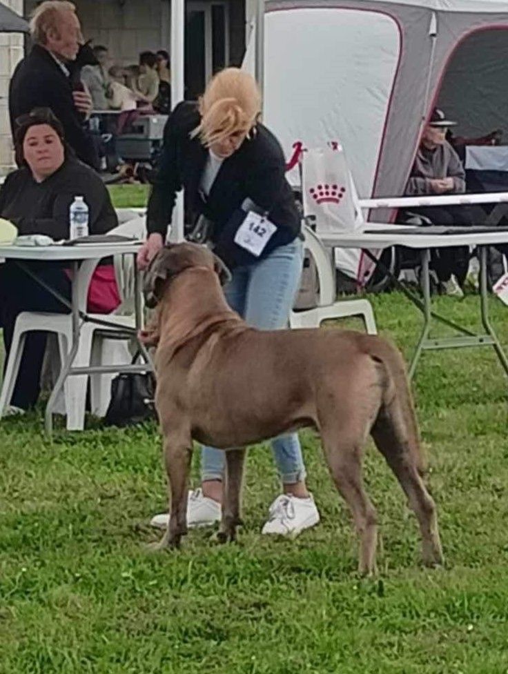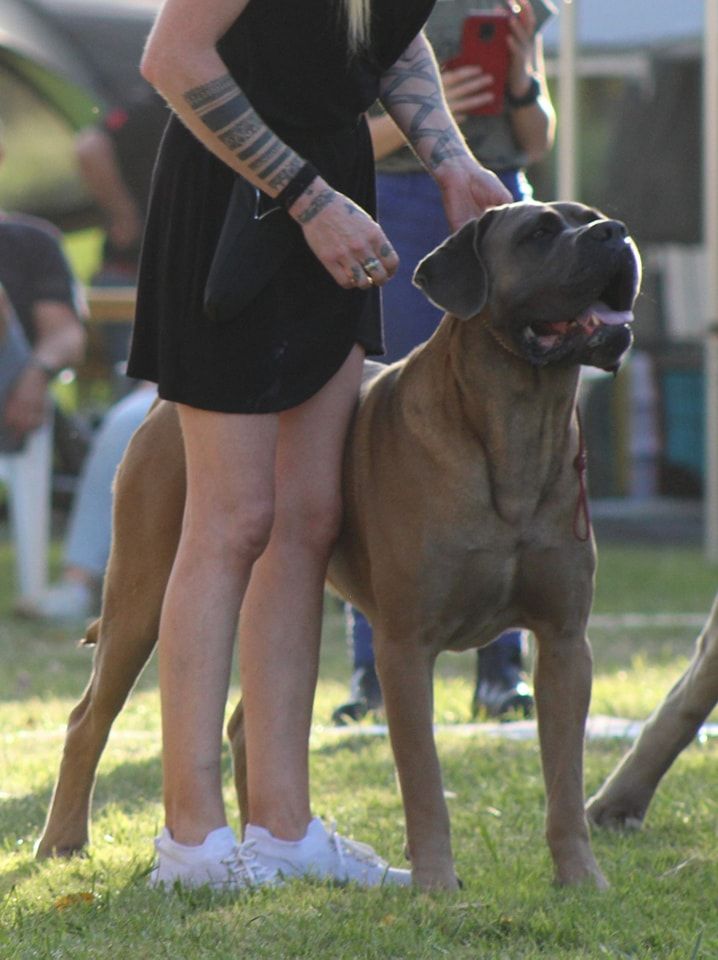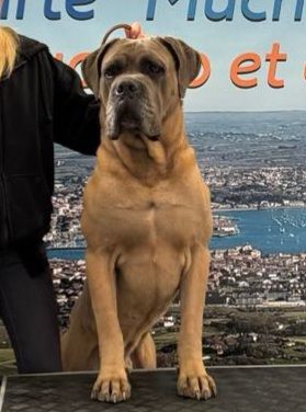 Joli dans le type, Excellente construction générale et proportions, Très jolie tête masculine, Excellent Cane Corso, Excellentes lignes de tête, Excellentes dents et articulé, mandibules bien larges, Excellente encolure, Excellentes lignes de dessus et de dessous, Excellentes angulations avant et arrières, Ouvre un peu les coudes à la marche, prise de terrain correcte