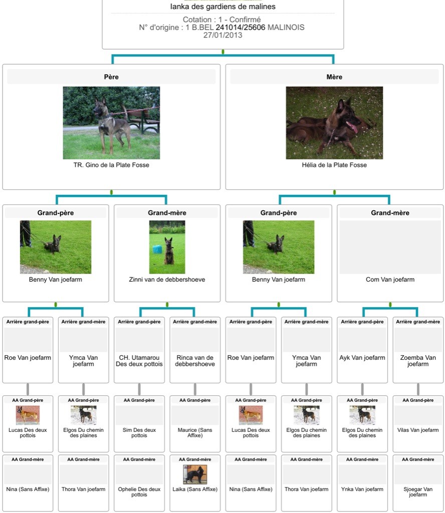Cette lignée maternelle est un travail de courants de sang sur la prestigieuse souche « Des Deux Pottois » par l’intermédiaire de la génétique « Van Joefarm », élevage qui a racheté Elgos du Chemin des Plaines, vice champion du monde de mondioring étalon qui est à l’origine de la morphologie plus puissante de certains malinois actuels de travail et très bien fixé dans cette lignée maternelle…