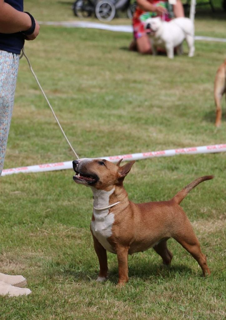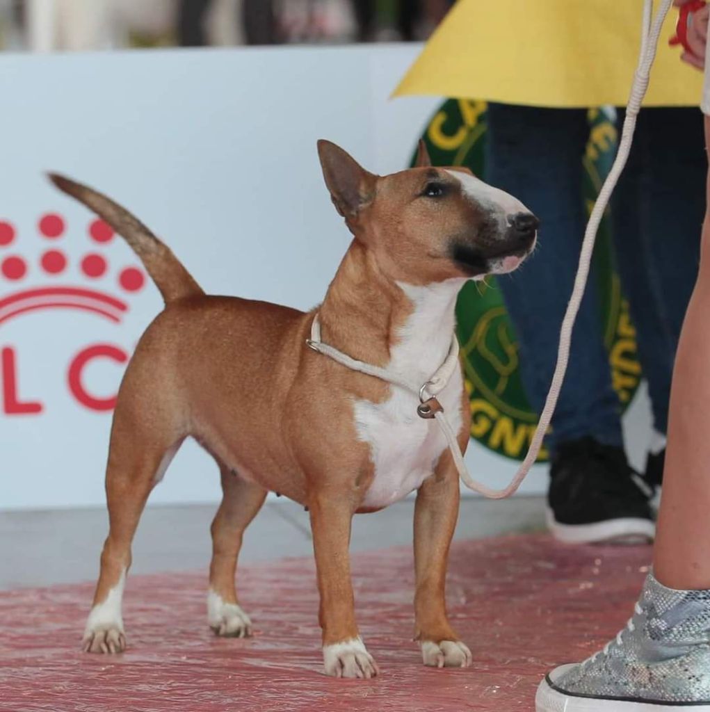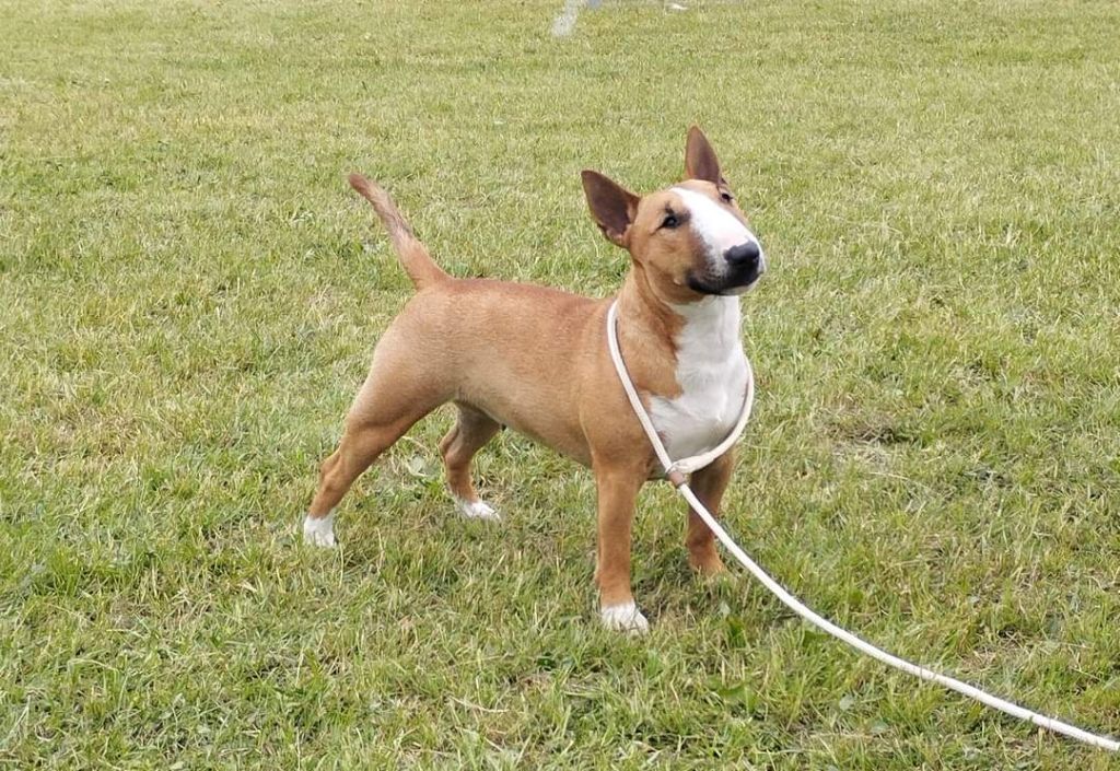 Chien Bull Terrier Miniature olrif Lady in red