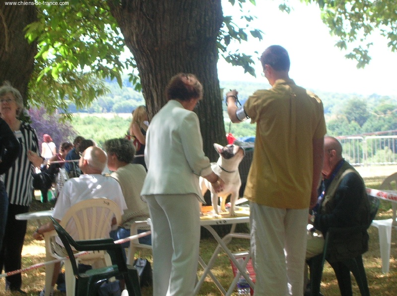 TB format, excellent prognatisme, tête très bien typée, exc crâne stop chanfrein, oreilles bien portées, excellent avant, dos bien dessiné, exc poitrine, exc arrière tb fouet, excellente demarche et allure.