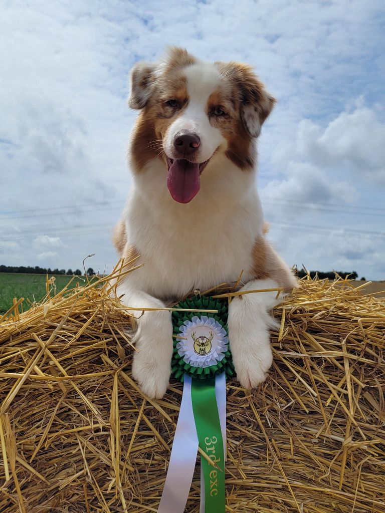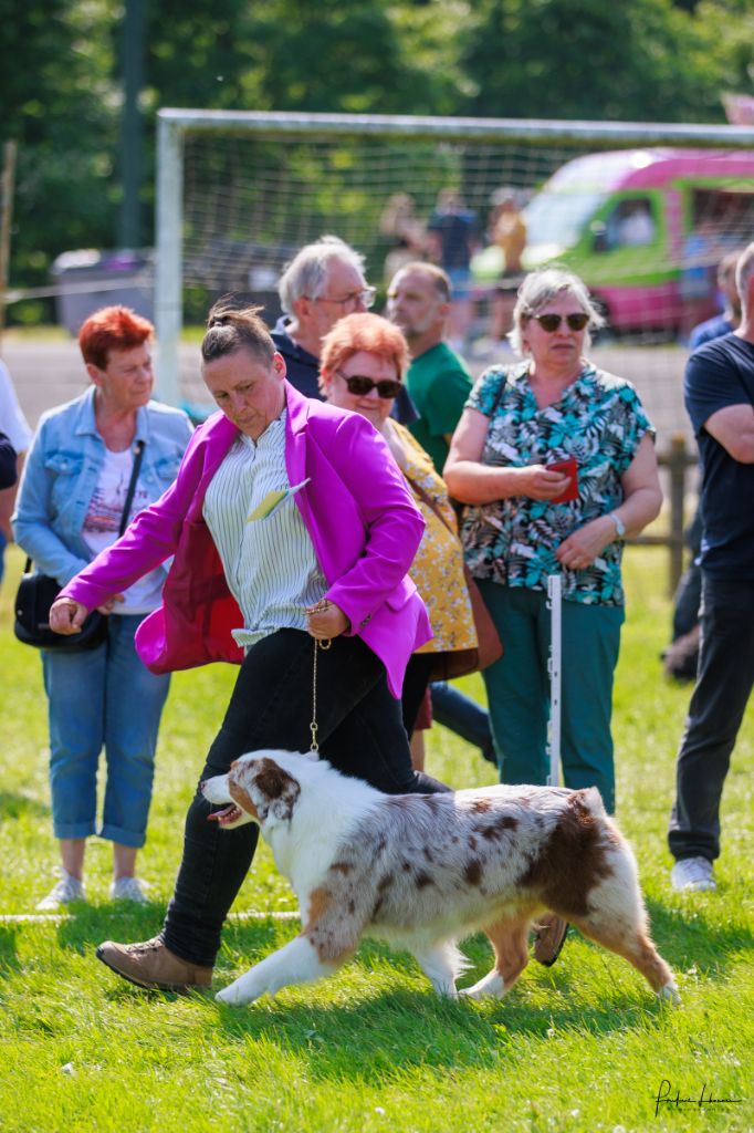 Très jolie chienne, magnifique condition, bonne tête, très bonne répartition du rouge merle, Très bonne angulation arrière, oreille très bien portée, Marche très bien, excellente ligne de dos