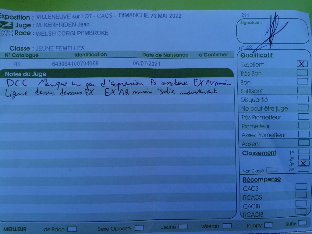 "10 mois, féminine, b volume de tête, stop marqué, DCC, attache oreilles 1 peu divergent B proportion, Exc dessus dessous, jolis pieds Exc aplombs, démarche régulière, fouet haut".
