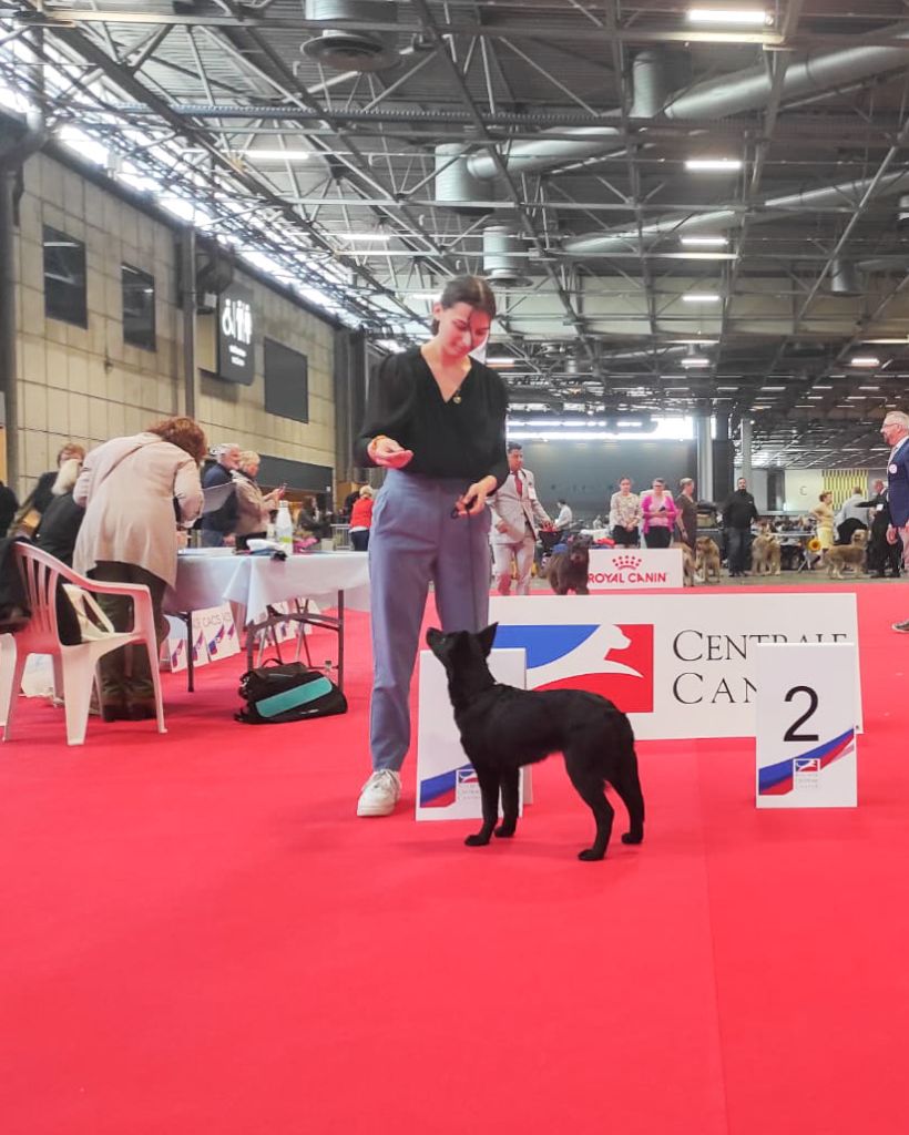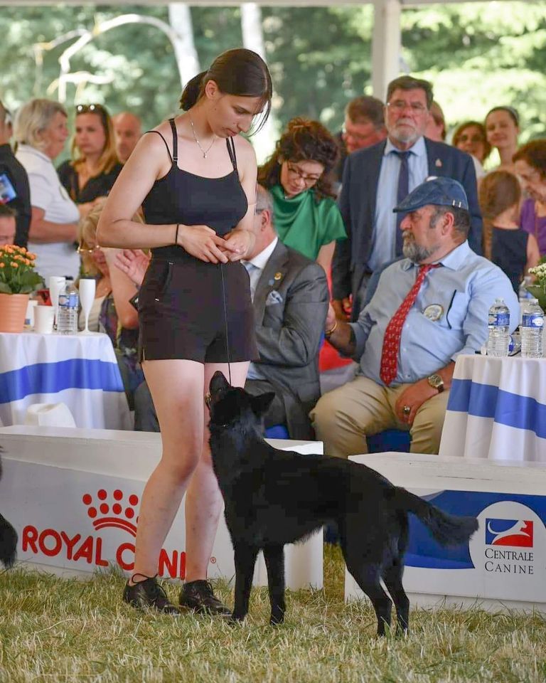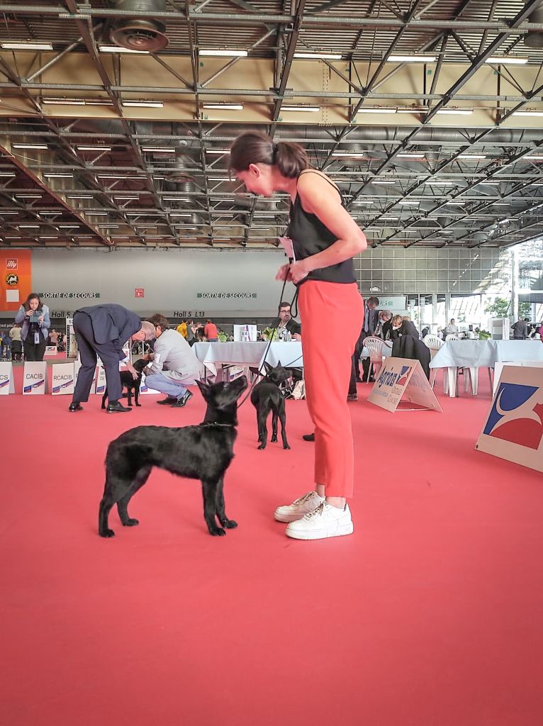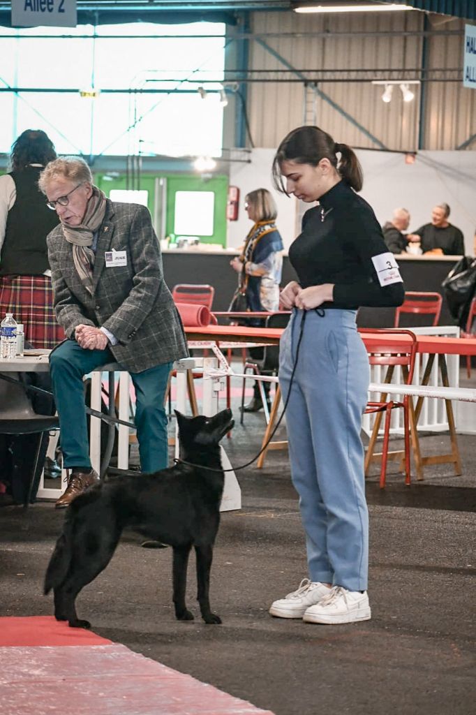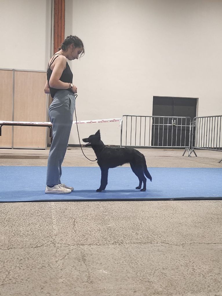 Très bon ensemble fémininExcellent ?il, excellentes oreillesDenture en ciseauxTrès bonnes épaules, Très bon volume de poitrineBon pied, jolie encolureTrès bonne arrière main, angulations avec un bon grassetBon fouet et croupeChienne très attentive, Marche bien