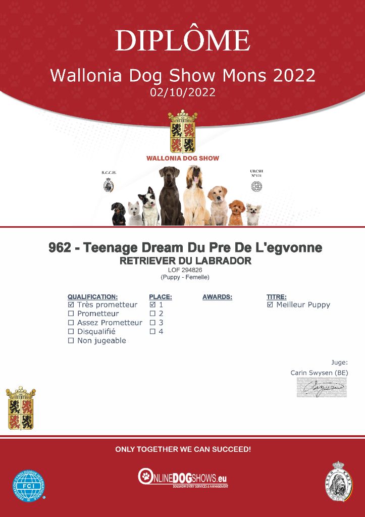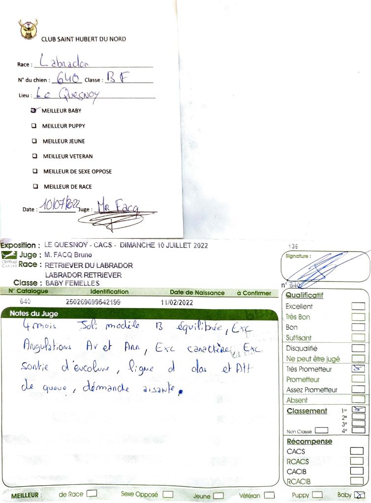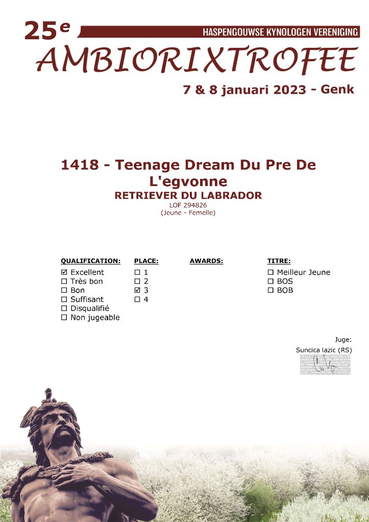 Le Quesnoy 2022 : 1er Très prometteur classe Baby & Meilleur Baby Mons 2022 (Belgique) : 1er Très Prometteur classe Puppy & Meilleur Puppy Genk 2023 (Belgique) : 3ème Excellent classe Jeune