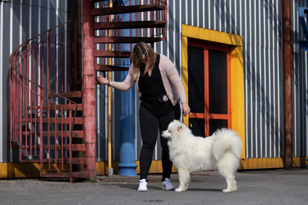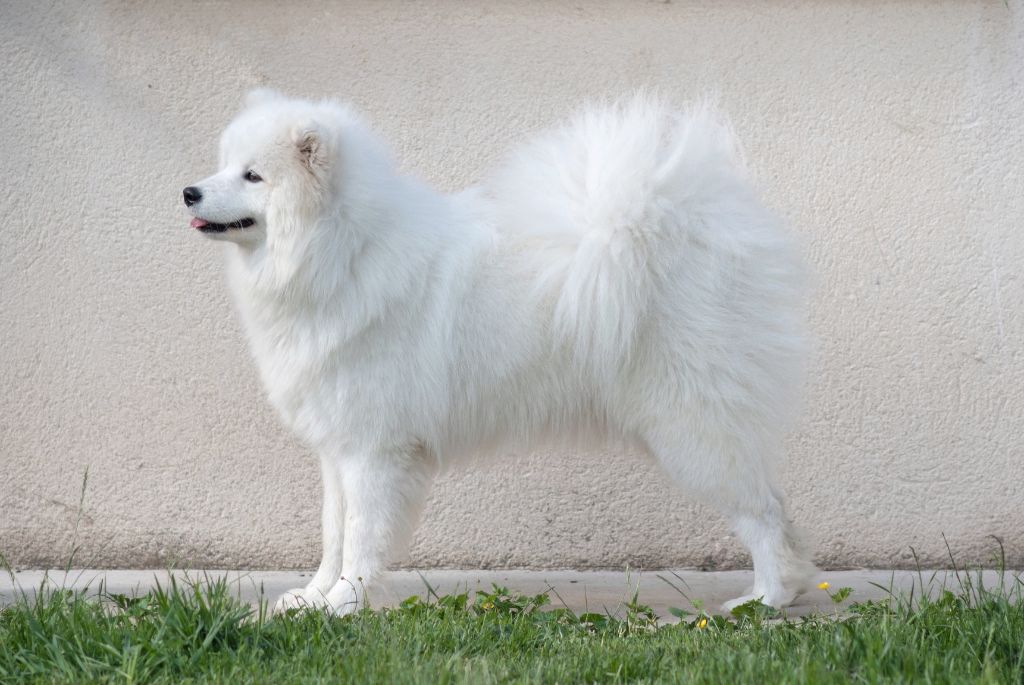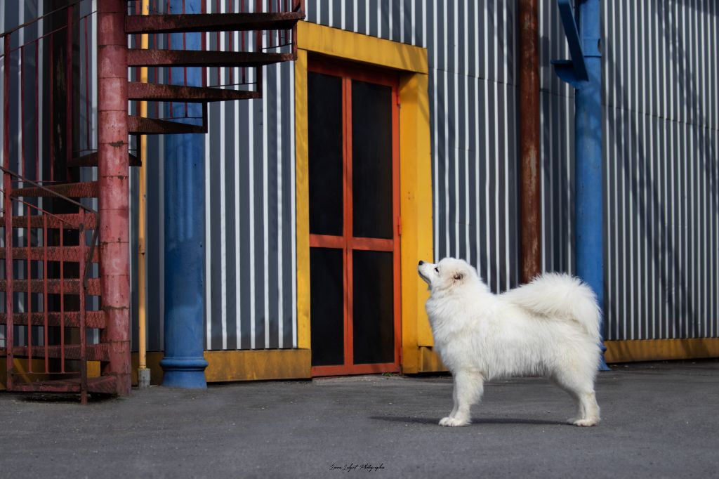 Chien Samoyède Look at lavina of dety metely