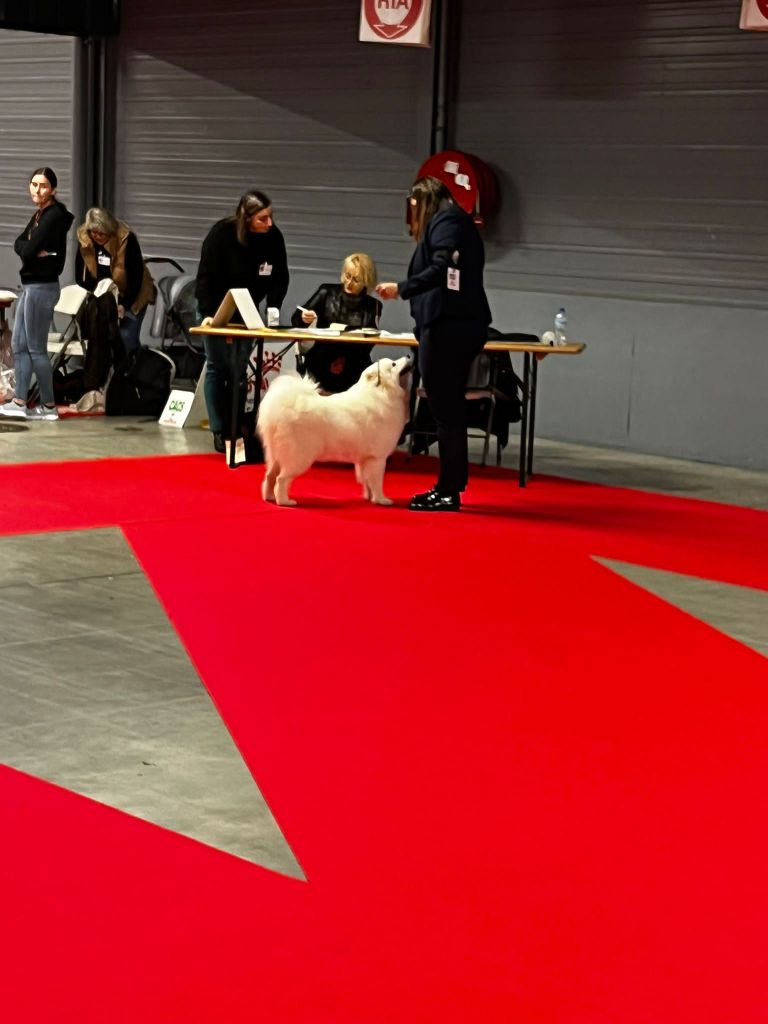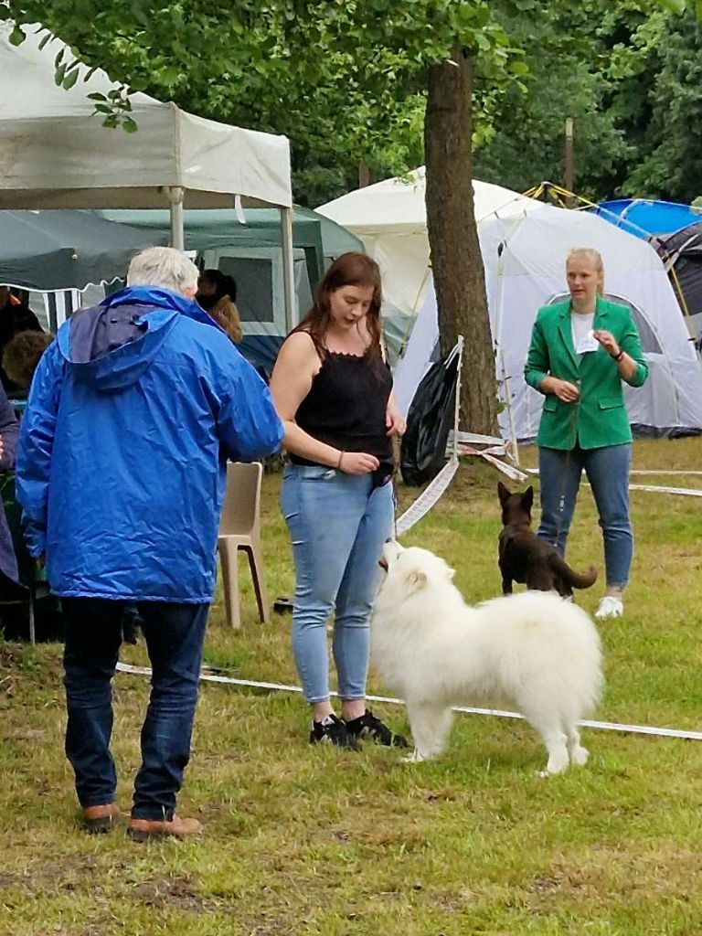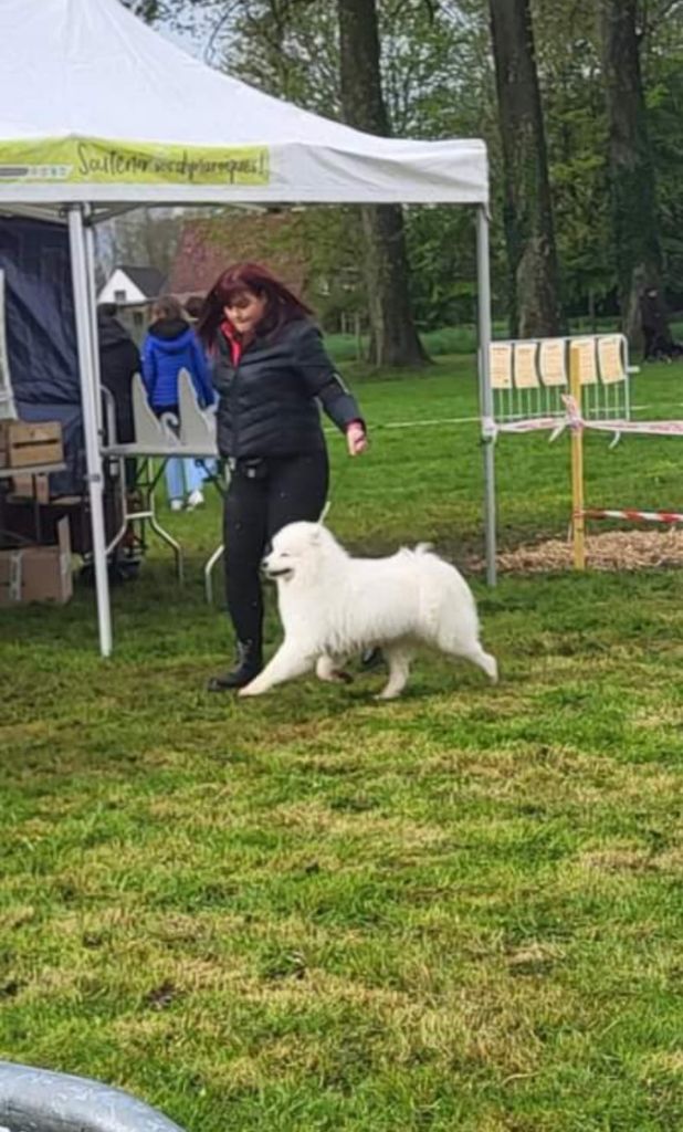Excellent sujet, un peu timide, excellente tête, excellents yeux, excellentes oreilles, dentition complète en ciseaux, excellente épaules et avant main, très bon pieds, excellente poitrine, très bonne lignes de dos, excellente posture / attache te port de fouet, démarche correcte.