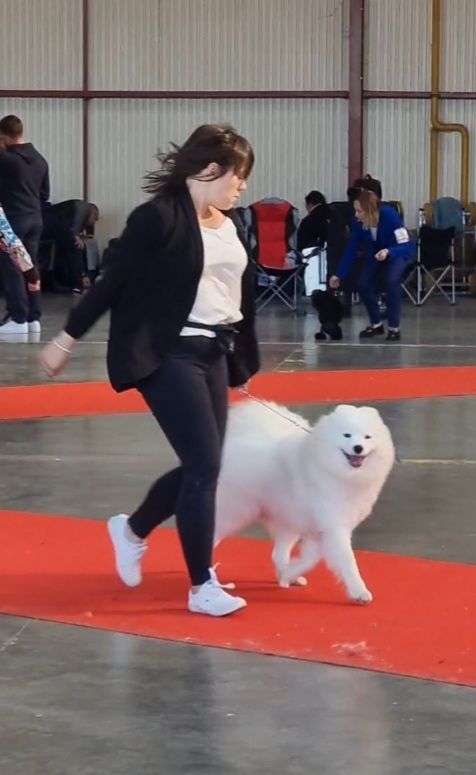 Très jolie sujet, excellente proportions, oreilles de bons format, bons yeux, bonne pigmentation,, dentition correcte en ciseaux, bonnes épaules et avant main, bons pieds, légèrement craintive ce jour, très bonne poitrine, très bonne ligne de dos, excellente posture, serre de l'arrière à la marche.