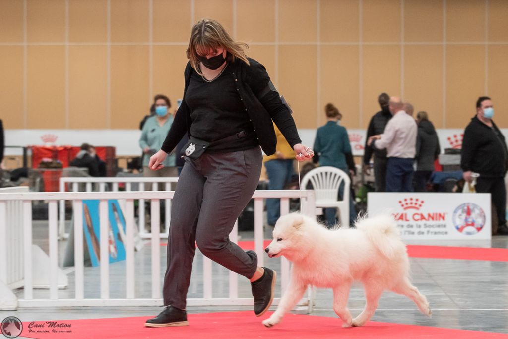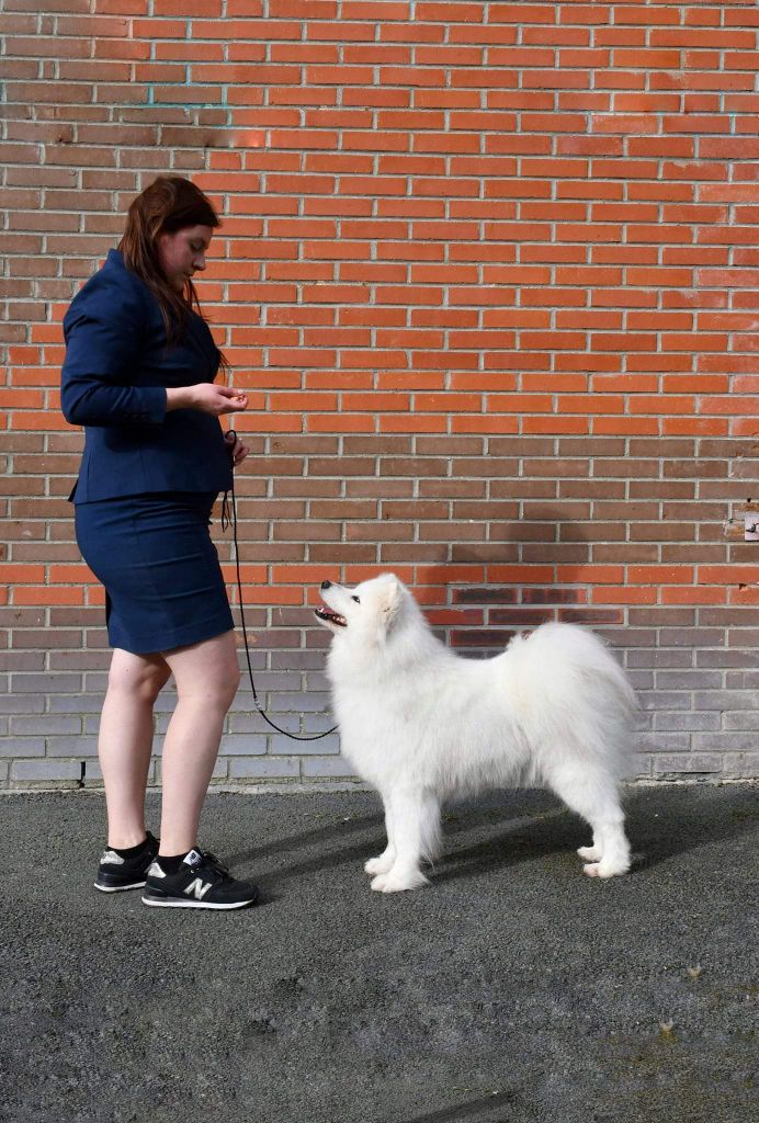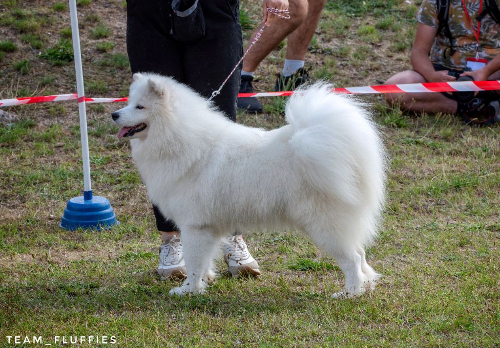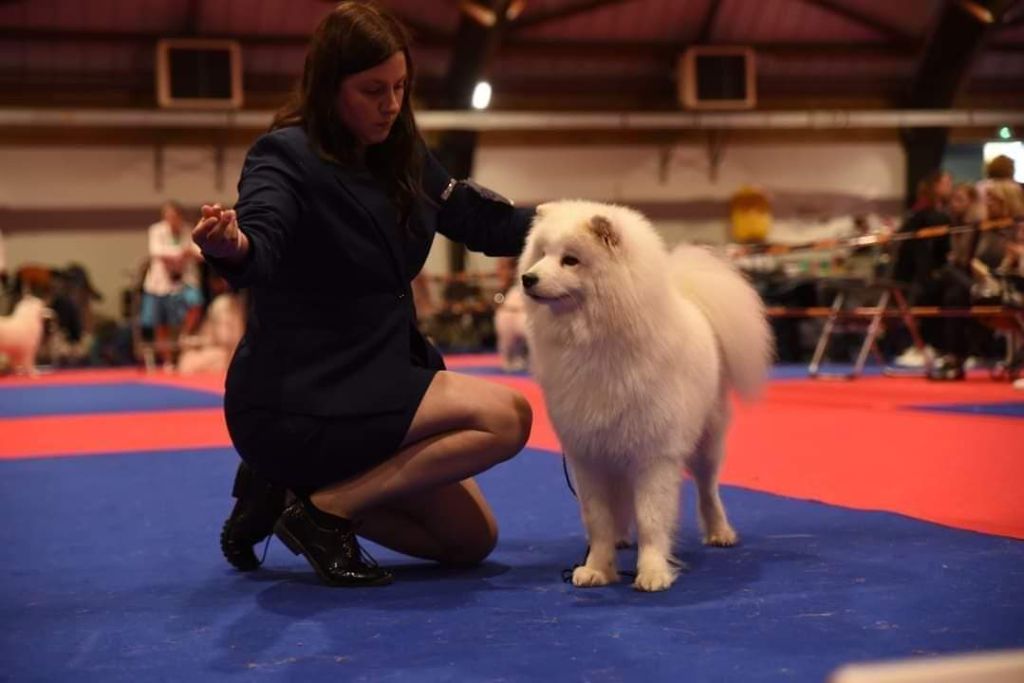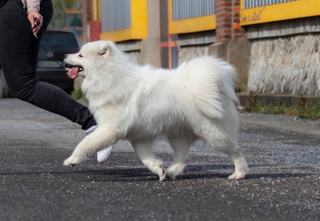 Truffe des neiges, bonne mâchoire, bon stop, bon chanfrein, oreilles bien attachées, jolie sourire, bonne poitrine, bon dessus, bonne encolure, bonne avant main, bonne attache de queue, angulations bien dessinées, bonne poussée, prise de terrain, se déplace bien.