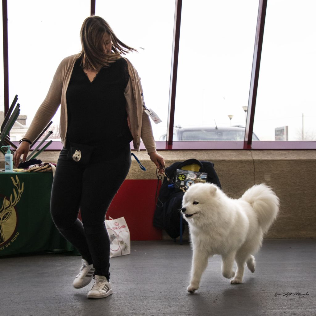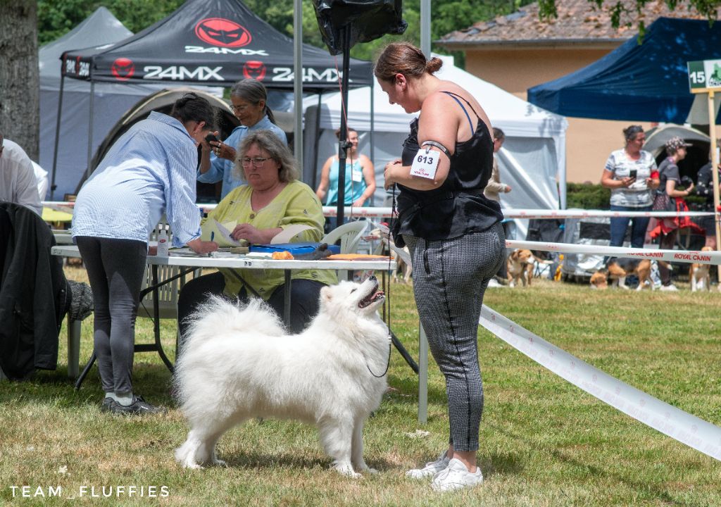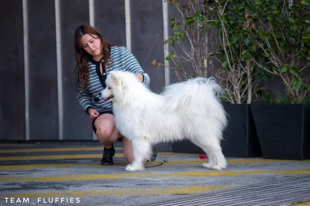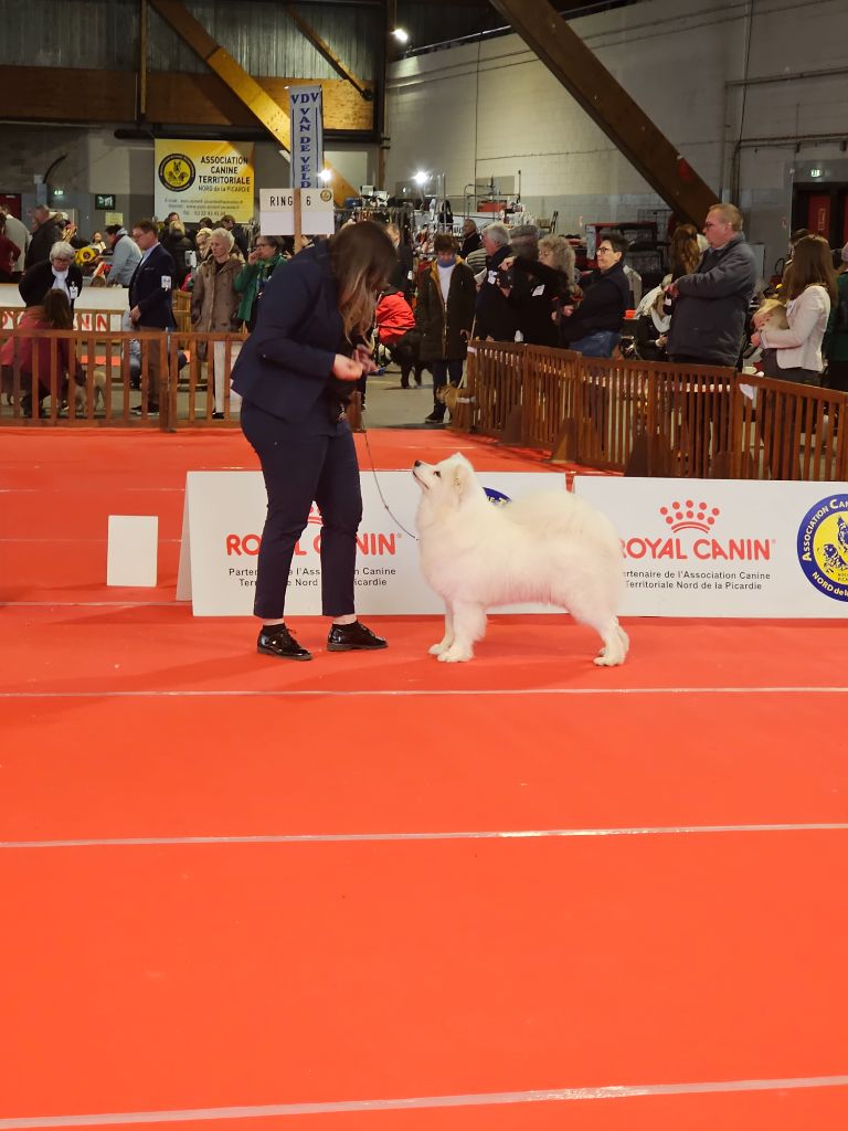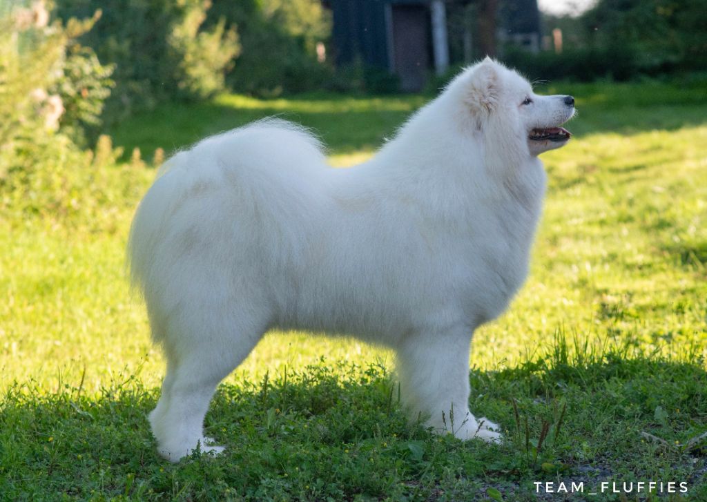 Truffe des neiges, bonne mâchoire, bon stop, bon chanfrein, oreilles bien attachées, jolie sourire, bonne poitrine, bon dessus, bonne encolure, bonne avant main, bonne attache de queue, angulations bien dessinées, bonne poussée, prise de terrain, se déplace bien.