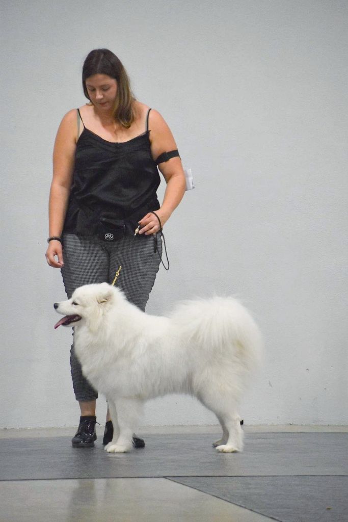 L'ensemble du corps demandé à se terminer en maturité et prendre un peu plus de fermeté, tête féminine, très bien proportionnée, aplombs et angulations parallèles, sujet qui n'a pas envie de se présenter, pas au meilleur de sa forme.
