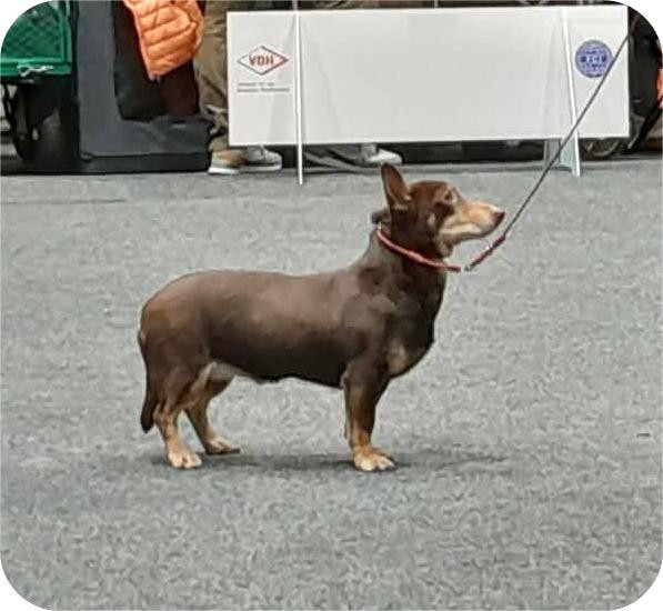 Sehr harmonisch aufgebaute Hündin, Schadel stirnabsatz und fang zueinander passend, Ohren stabil getragen, Augen frabe zur Fellfarbe passend, gefestige Oberlinie, markante Vorbrust, alle Gliemassen richtig gestellt une gewinkelt, flissend und ungezwungene Trabaktion, aufmerksames verhalten