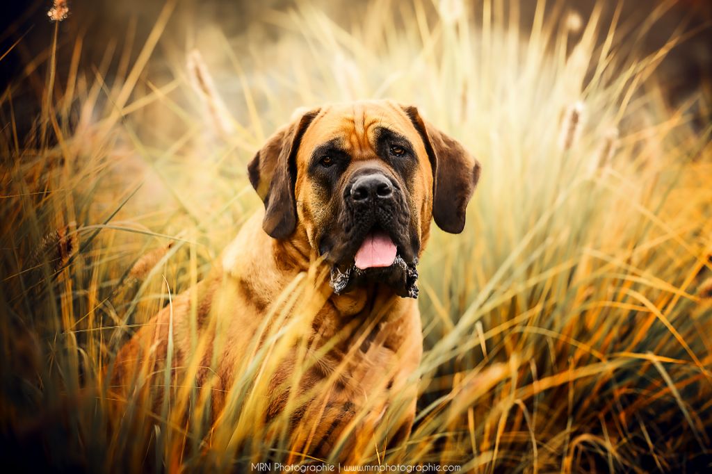 Grande et athlétique femelle abricot, Moon est intelligente et courageuse . Ellea hérité de sa grand mère Charlotte sa couleur intense et ses jolis pieds de chat, de sa mère Palme d'or son tempérament gardien et protecteur et de son père George son ossature puissante et sa hauteur. Moon a été initiée dès son plus jeune âge au Mantrailing et elle est le premier Mastiff en France a obtenir le diplôme d'Instinct Test.